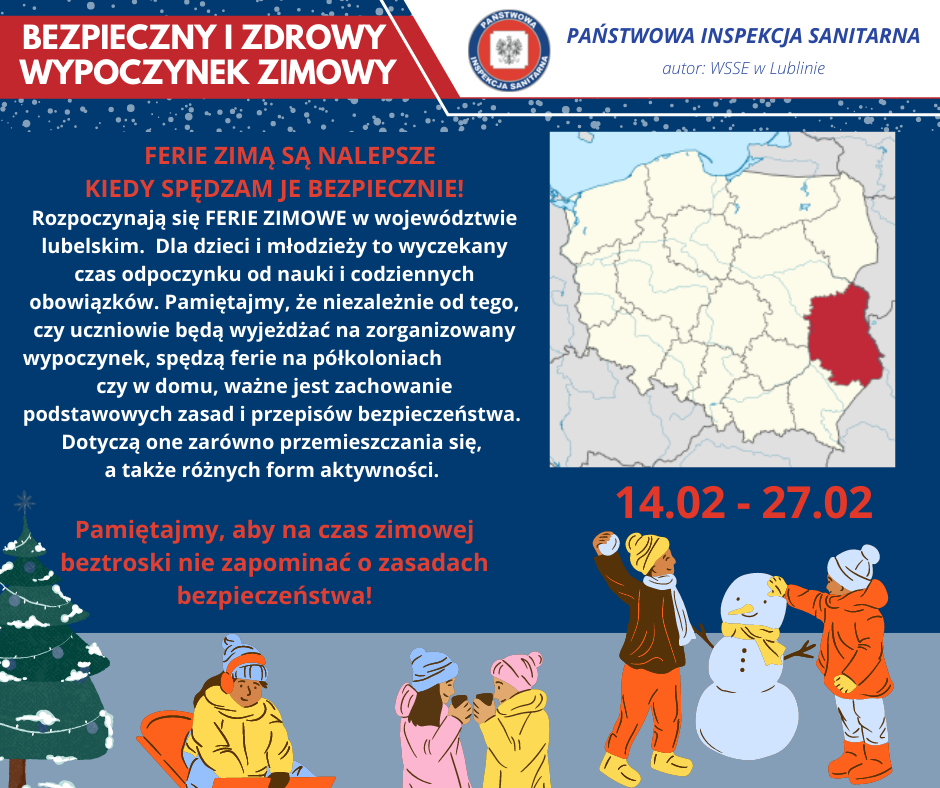 Rozpoczynają się FERIE ZIMOWE w województwie lubelskim. Dla dzieci i młodzieży to wyczekany czas odpoczynku od nauki i codziennych obowiązków. Pamiętajmy, że niezależnie od tego, czy uczniowie będą wyjeżdżać na zorganizowany wypoczynek, spędzą ferie na półkoloniach czy w domu, ważne jest zachowanie podstawowych zasad i przepisów bezpieczeństwa. Dotyczą one zarówno przemieszczania się, a także różnych form aktywności.