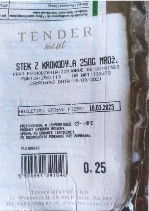 Ostrzeżenie publiczne dotyczące żywności Wykrycie bakterii Salmonella w jednej partii produktu „Stek z krokodyla”, 250 g, mrożony