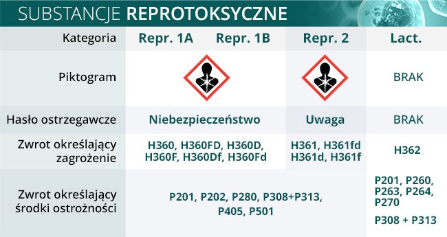 - Kategorię 1 (Repr. 1A i Repr. 1B) – substancje działające szkodliwie na rozrodczość u ludzi, lub co do których istnieje domniemanie, że działają szkodliwie na rozrodczość u ludzi;
