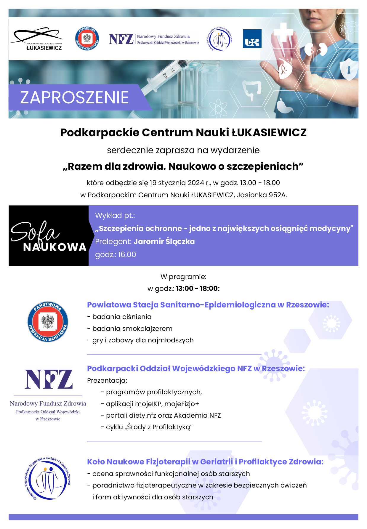 Serdecznie zapraszamy na wydarzenie „Razem dla zdrowia. Naukowo o szczepieniach”, które odbędzie się 19 stycznia w godz. 13.00-18.00 w Podkarpackim Centrum Nauki Łukasiewicz.