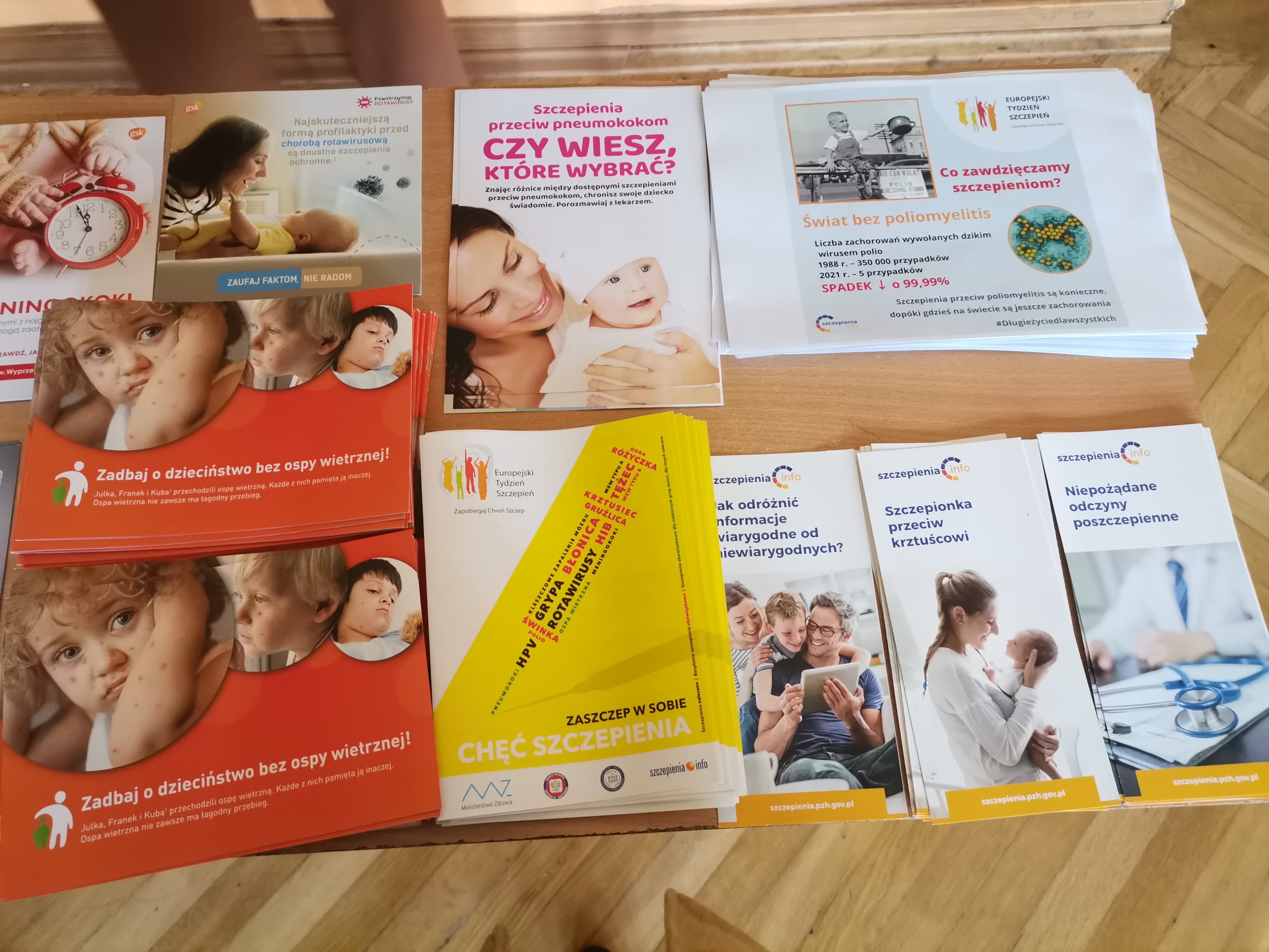 Ponadto pracownicy Promocji Zdrowia i Oświaty Zdrowotnej wraz z Sekcją Higieny Dzieci i Młodzieży zorganizowali stoisko informacyjno-edukacyjne, gdzie społeczność szkoły mogła skorzystać z materiałów edukacyjnych dotyczących szczepień ochronnych.