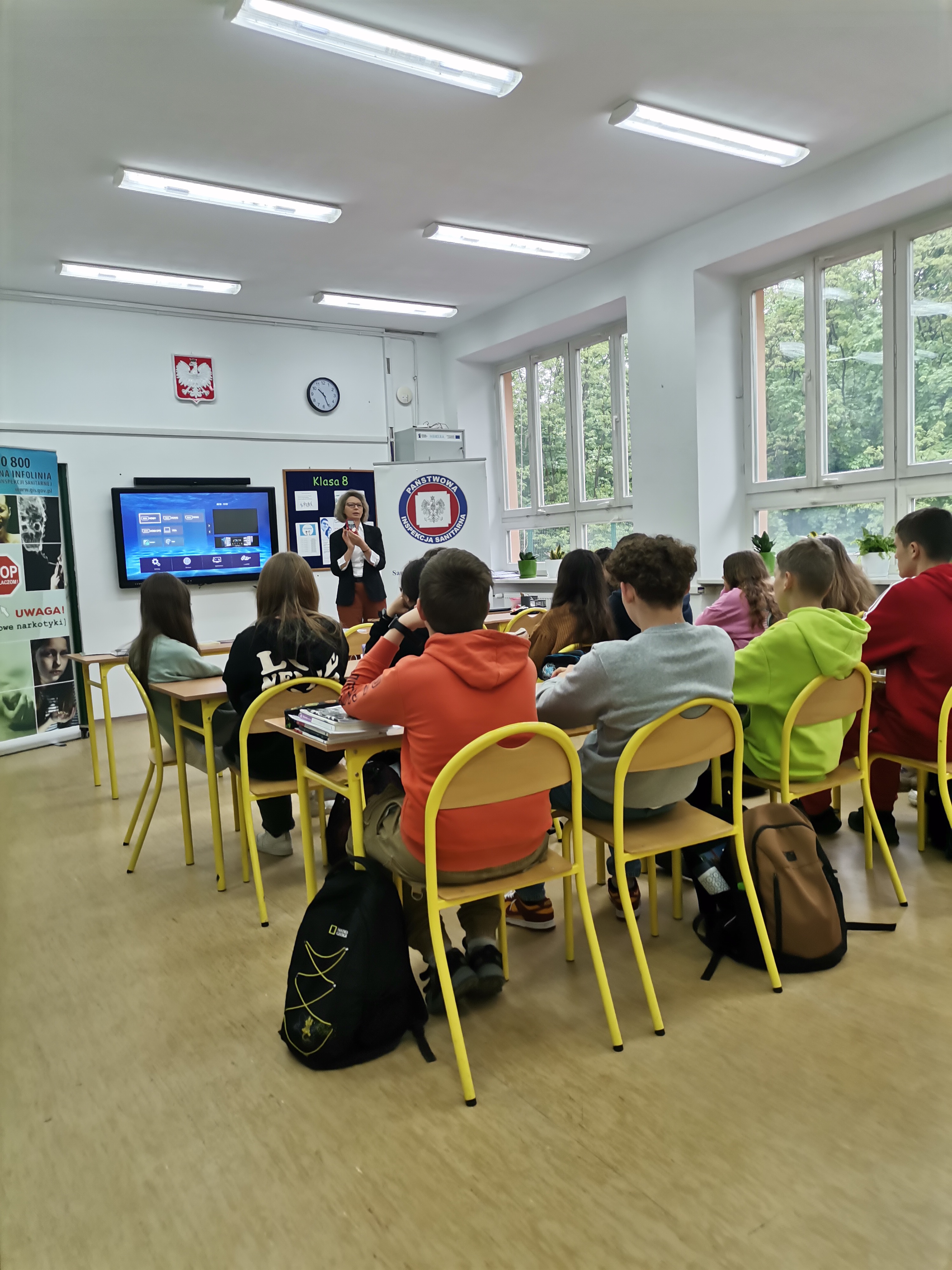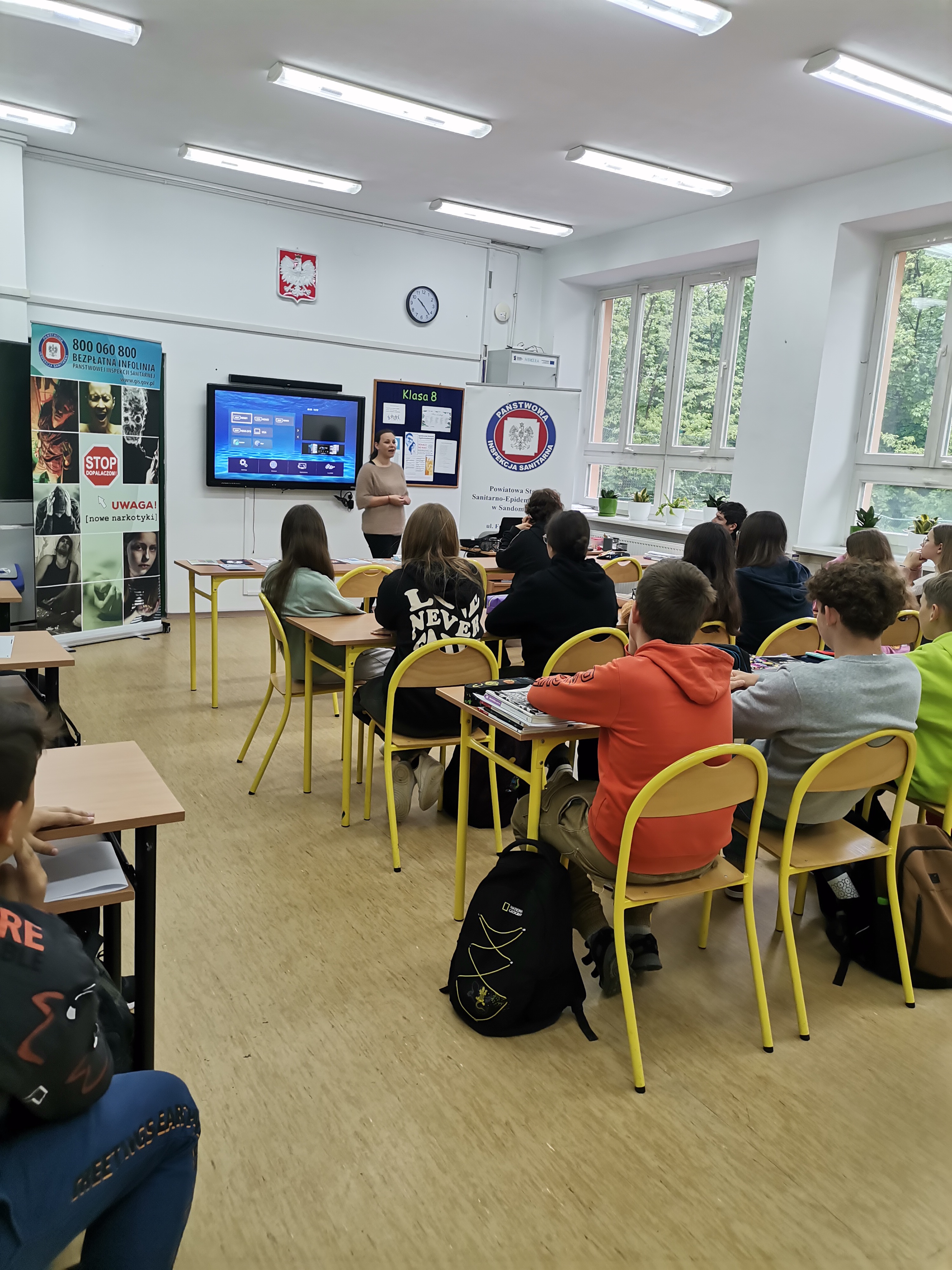 - Dla starszych uczniów klas VII-VIII tematyką spotkania była profilaktyka uzależnień (tytoń, e-papierosy, narkotyki, dopalacze) oraz tak zwane energetyki. Emitowano film z serii Nie zamykaj oczu! pt: „Do grobowej deski”, w którym omówione są konsekwencje zażywania substancji uzależniających. Prezentowano smokerlyzer wskazujący poziom tlenku węgla w wydychanym powietrzu u osoby palącej.