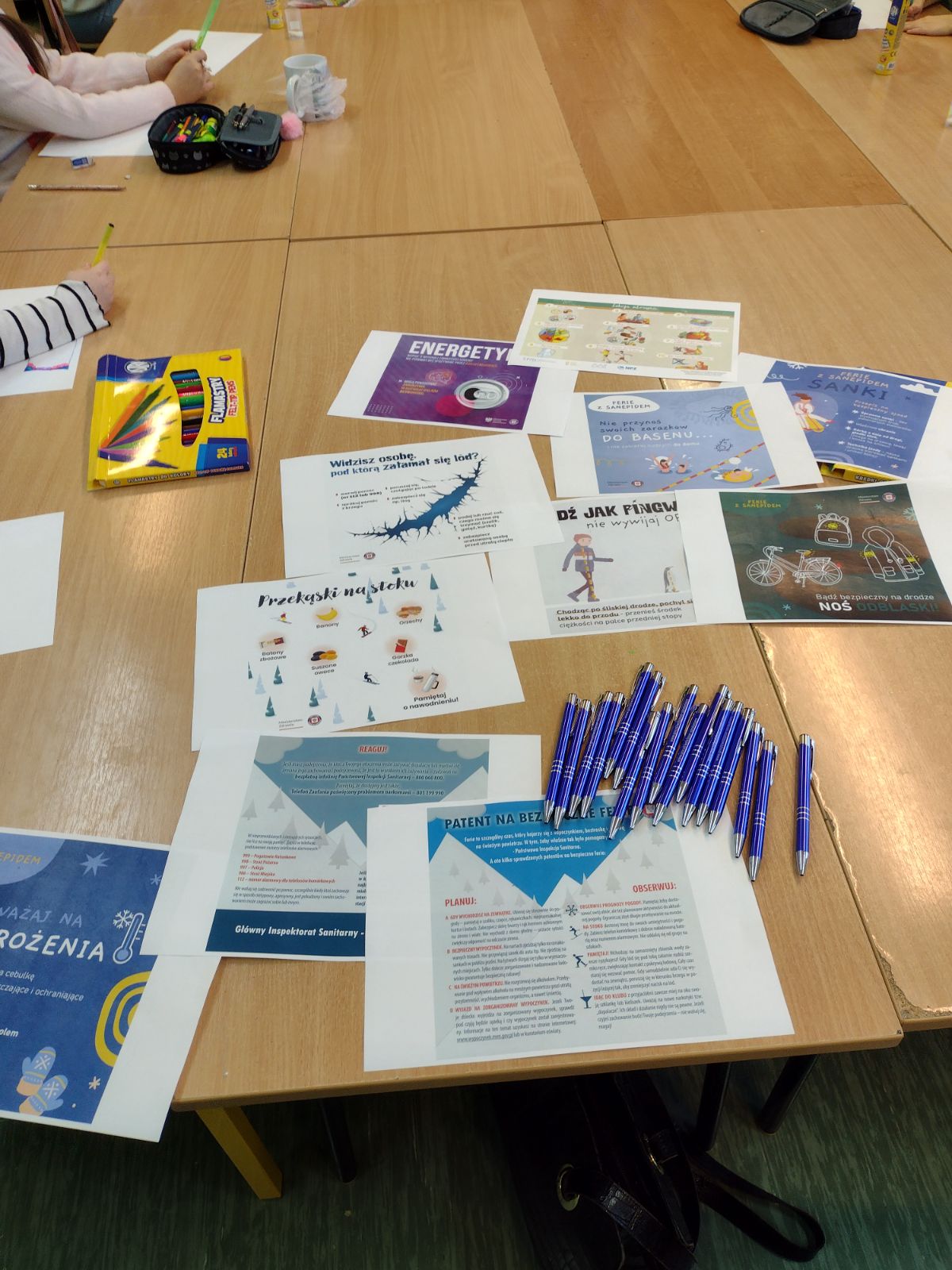 Tematem spotkania edukacyjnego było: Bezpieczeństwo zdrowotne dzieci podczas wypoczynku zimowego. Z uczestnikami półkolonii omówiono, jak należy chronić się przed zimnem, dbać o bezpieczeństwo, jak zdrowo się odżywiać i dbać o higienę.
