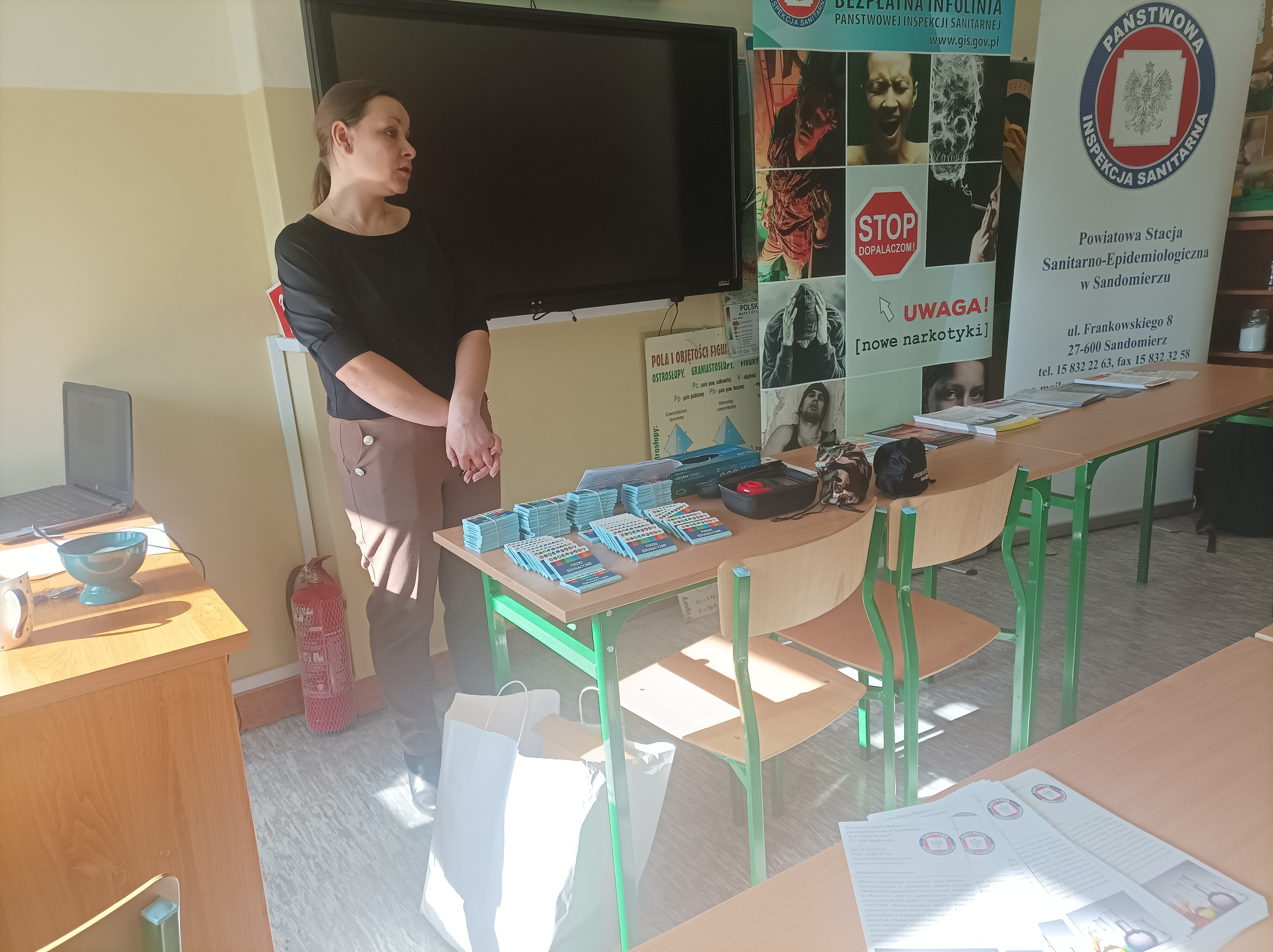 - W ramach doradztwa zawodowego pracownik PSSE w Sandomierzu przedstawił zadania w zakresie zdrowia publicznego podejmowane przez Inspekcję Sanitarną. Omówiono zadania, kompetencje i specyfikę pracy w poszczególnych działach Powiatowej Stacji Sanitarno-Epidemiologicznej w Sandomierzu. Inspekcja Sanitarna w zakresie zdrowia publicznego wykonuje zadania dotyczące higieny i zdrowia, między innymi w zakresie wody pitnej, czystości powietrza, utrzymania higieny w zakładach pracy oraz budynkach użyteczności publicznej, jak również nadzoru nad warunkami zdrowotnymi żywności, żywienia i produktów kosmetycznych. Sprawowanie nadzoru w wyżej wymienionych obszarach ma na celu ochronę zdrowia ludzkiego.