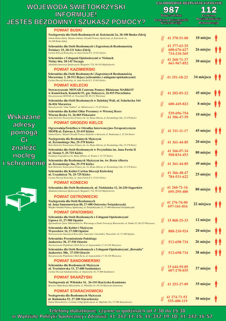 Wykaz placówek udzielających tymczasowego schronienia osobom będącym w kryzysie bezdomności, funkcjonujących na terenie województwa świętokrzyskiego otrzymany ze Świętokrzyskiego Urzędu Wojewódzkiego opracowany przez Wydział Polityki Społecznej i Zdrowia Świętokrzyskiego Urzędu Wojewódzkiego wraz z Wojewódzkim Zespołem Zarządzania Kryzysowego.