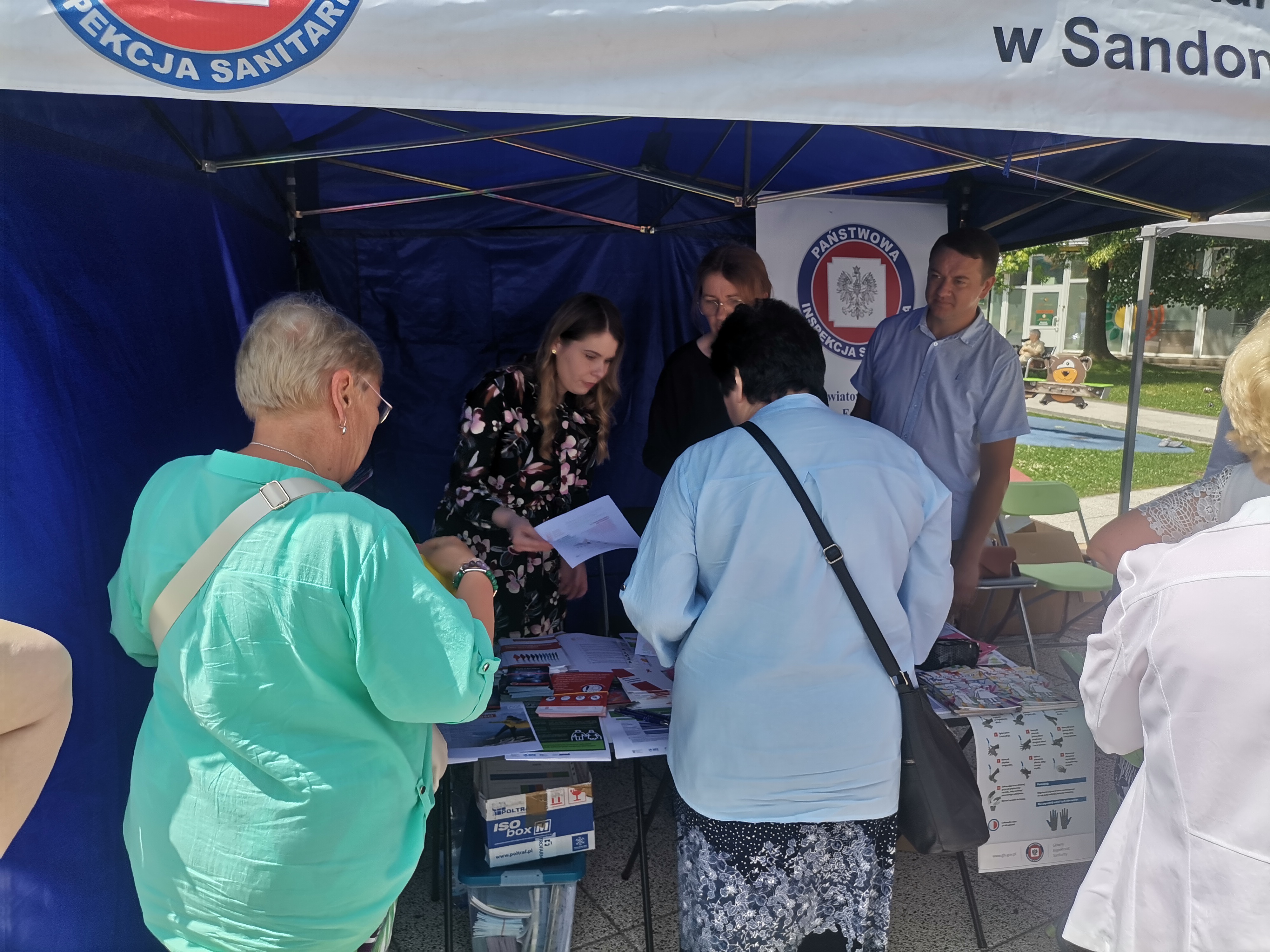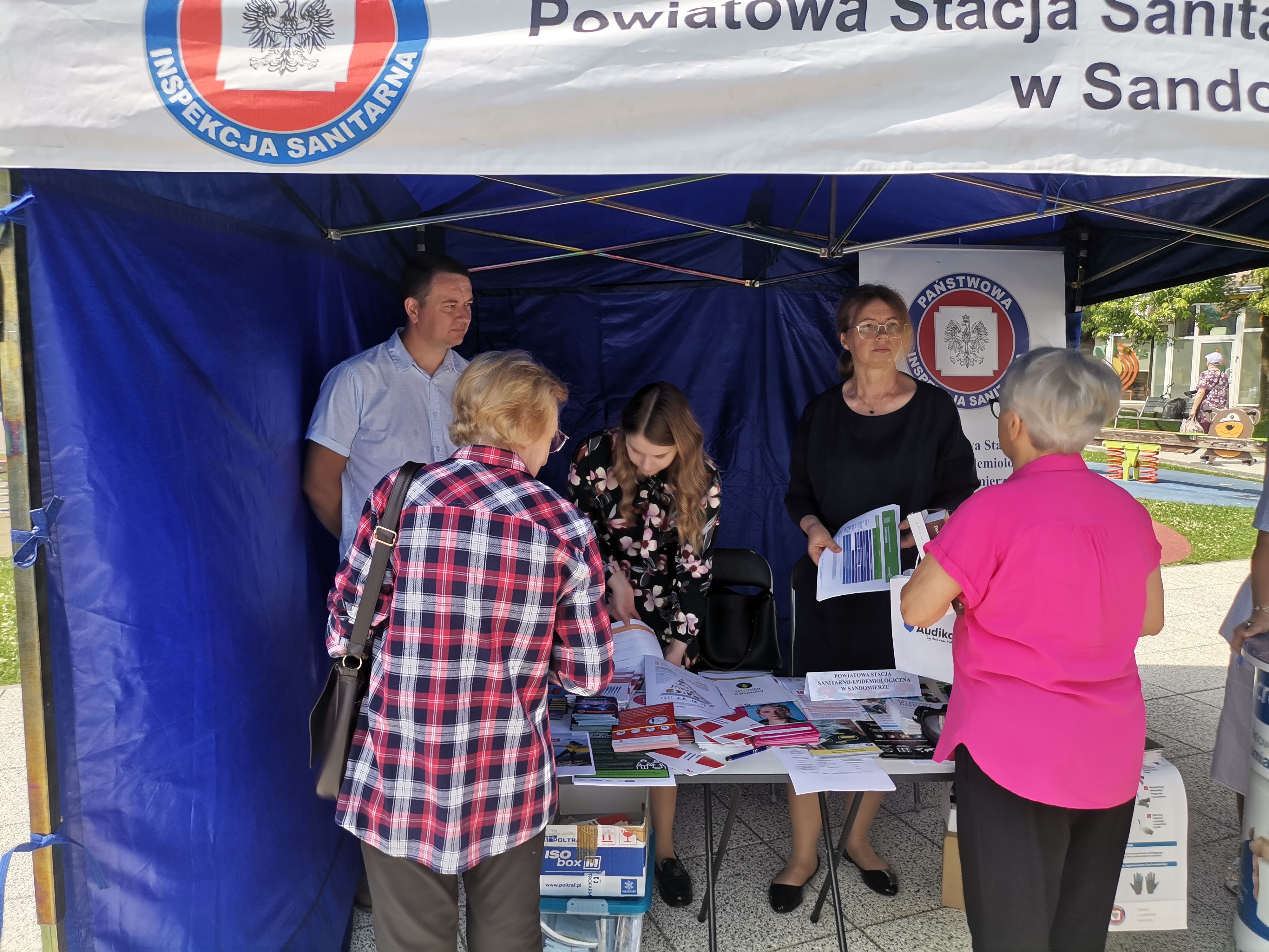 Pracownicy Powiatowej Stacji Sanitarno-Epidemiologicznej udzielali informacji na tematy prozdrowotne. Zainteresowanych seniorów informowano o profilaktyce chorób zakaźnych, zasadach bezpiecznego grzybobrania, profilaktyce chorób odkleszczowych, zasadach zdrowego odżywiania, szkodliwości używek i energetyków oraz profilaktyce poprzez szczepienia ochronne. Osobom zainteresowanym udzielano informacji oraz rozdawano materiały edukacyjne. Prezentowano alkogoogle i narkogoogle - okulary symulujące odczucia po zażyciu substancji psychoaktywnych (alkohol, narkotyki czy tzw. „dopalacze”).