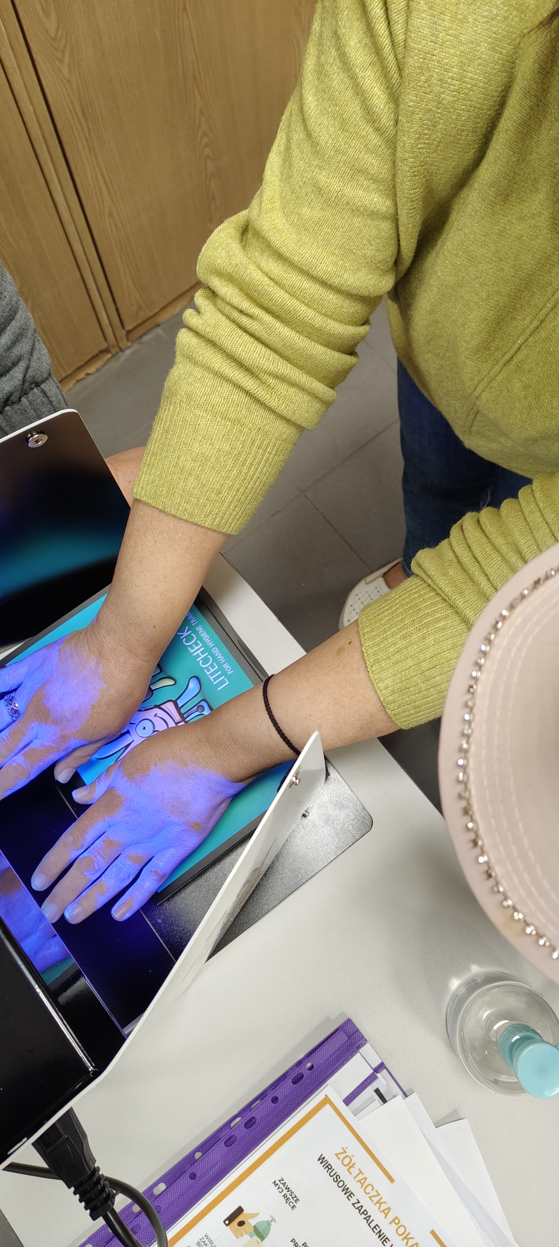 Prezentowaliśmy prawidłową technikę mycia i dezynfekcji rąk oraz sprawdzaliśmy przy pomocy urządzenia z lampą UV czy technika mycia rąk była prawidłowa.