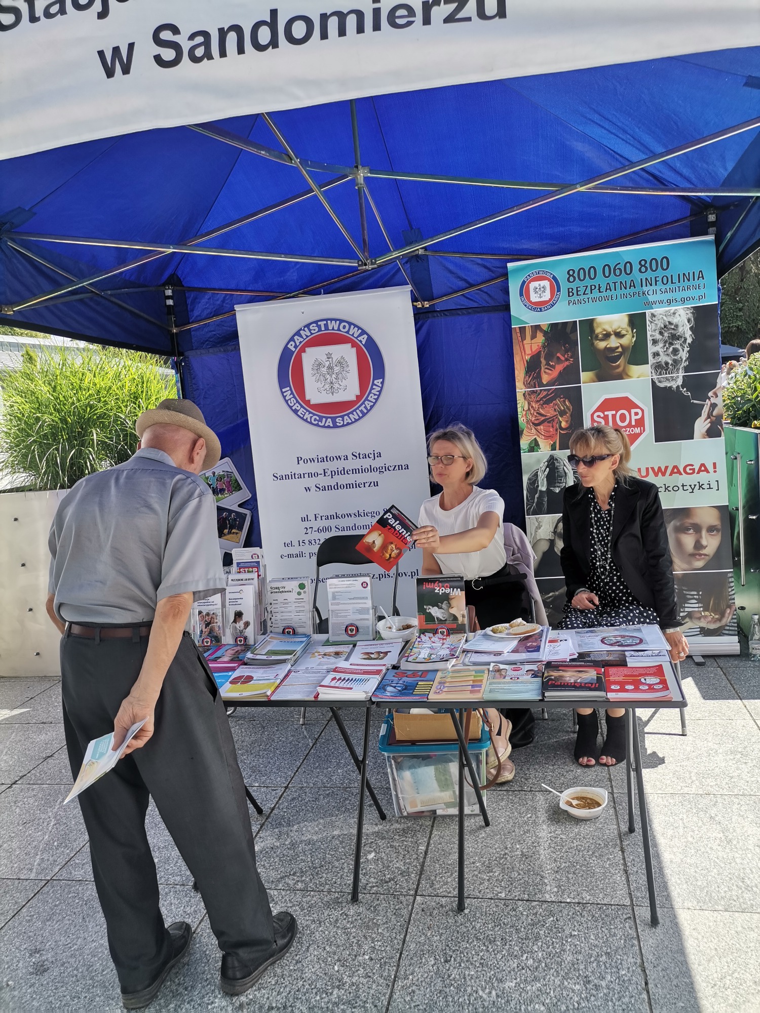 W dniu 23 czerwca 2022r. podczas trwania cyklicznej imprezy - Sandomierskie Senioralia 2022 pn. „To i owo na ludowo” na placu 3 Maja w Sandomierzu w godzinach 11.00 - 14.00 pracownicy Powiatowej Stacji Sanitarno-Epidemiologicznej udzielali informacji na tematy prozdrowotne. Na stoisku profilaktyczno - informacyjnym zainteresowanych seniorów informowano o zasadach bezpieczeństwa podczas trwania upałów, profilaktyce chorób infekcyjnych, zasadach bezpiecznego grzybobrania, profilaktyce chorób odkleszczowych i szkodliwości używek. Osobom zainteresowanym udzielano informacji oraz rozdawano materiały edukacyjne.