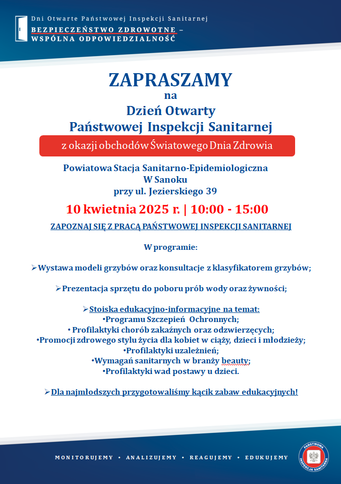 Z okazji Światowego Dnia Zdrowia zapraszamy 10 kwietnia 2025 roku na Dzień Otwarty Państwowej Inspekcji Sanitarnej województwa podkarpackiego! To doskonała okazja, by odkryć, jak funkcjonuje Sanepid i jak codziennie dba o nasze bezpieczeństwo. Przyjdź, weź udział w pokazach, warsztatach i uzyskaj cenne porady zdrowotne! Dla dzieci przygotowaliśmy ciekawy kącik gier i zabaw edukacyjnych!