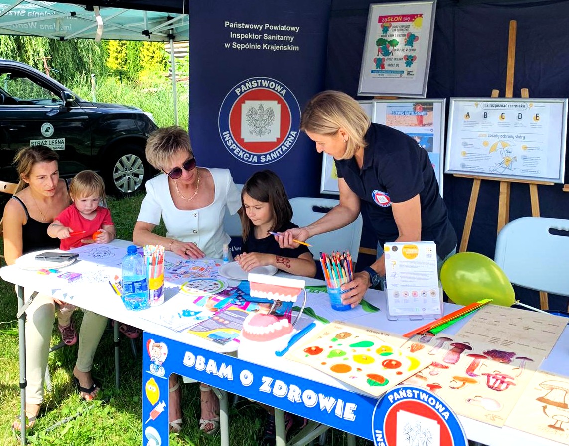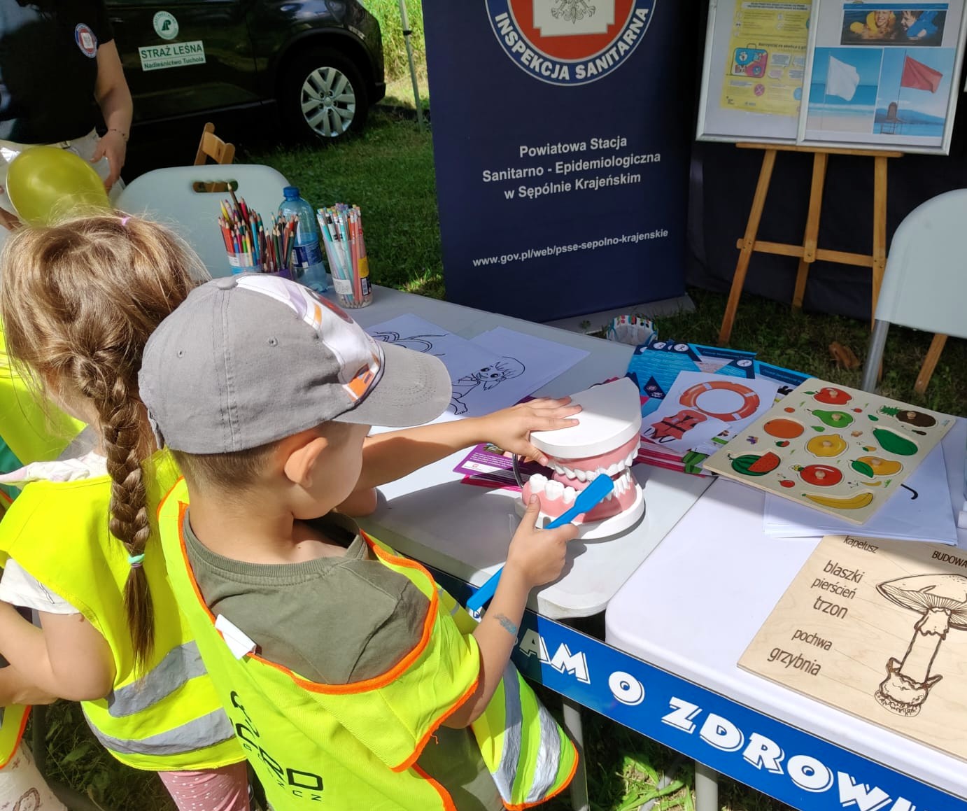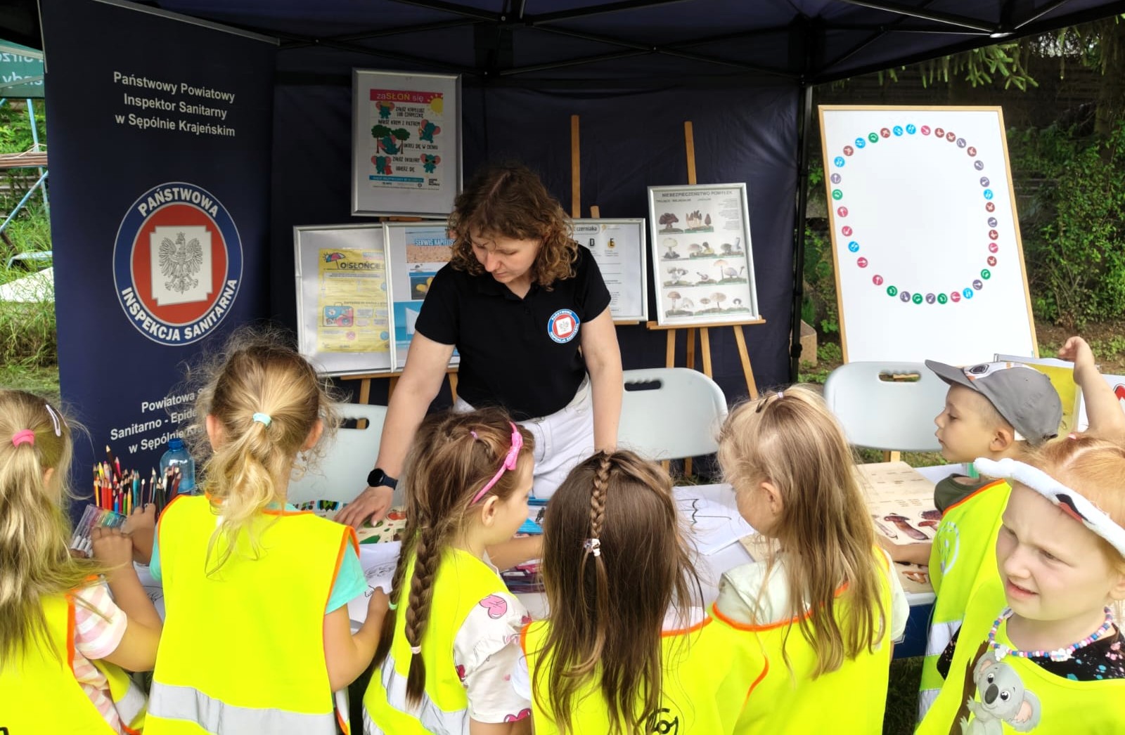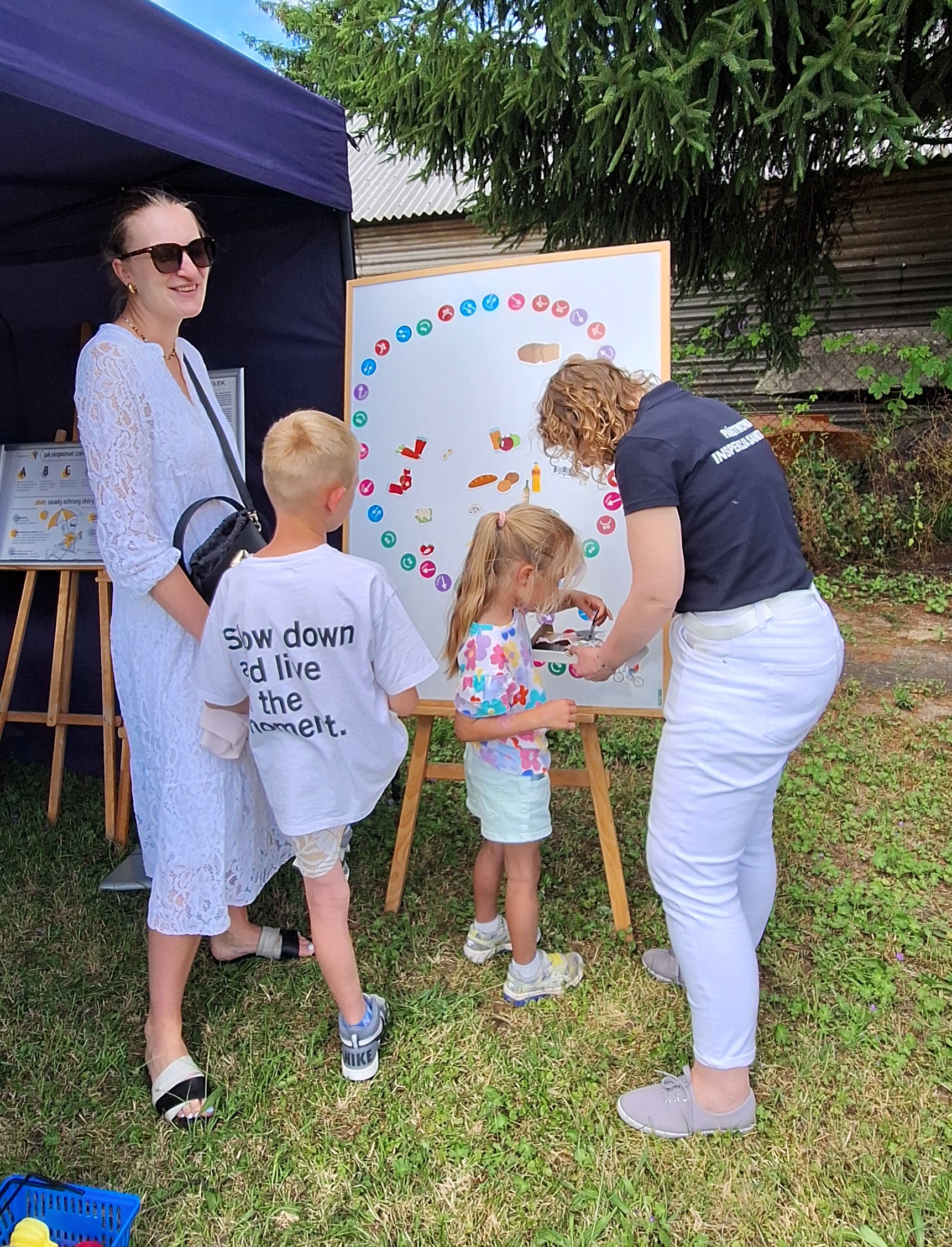 Z tej okazji przygotowaliśmy stoisko informacyjno-edukacyjne poświęcone zasadom bezpiecznych wakacji - takie działania od wielu lat realizujemy na terenie naszego powiatu we współpracy z Przedstawicielami Policji. Odwiedzający mogli zapoznać się z praktycznymi wskazówkami dotyczącymi m.in. bezpiecznego wypoczynku nad wodą, unikania udaru cieplnego, ochrony przed kleszczami i ukąszeniami owadów, a także zasad higieny w czasie letnich wyjazdów. Dla najmłodszych przygotowaliśmy gry edukacyjne i kolorowanki, dzięki którym w przystępny i atrakcyjny sposób przyswajali wiedzę na temat bezpiecznych zachowań podczas wakacji.