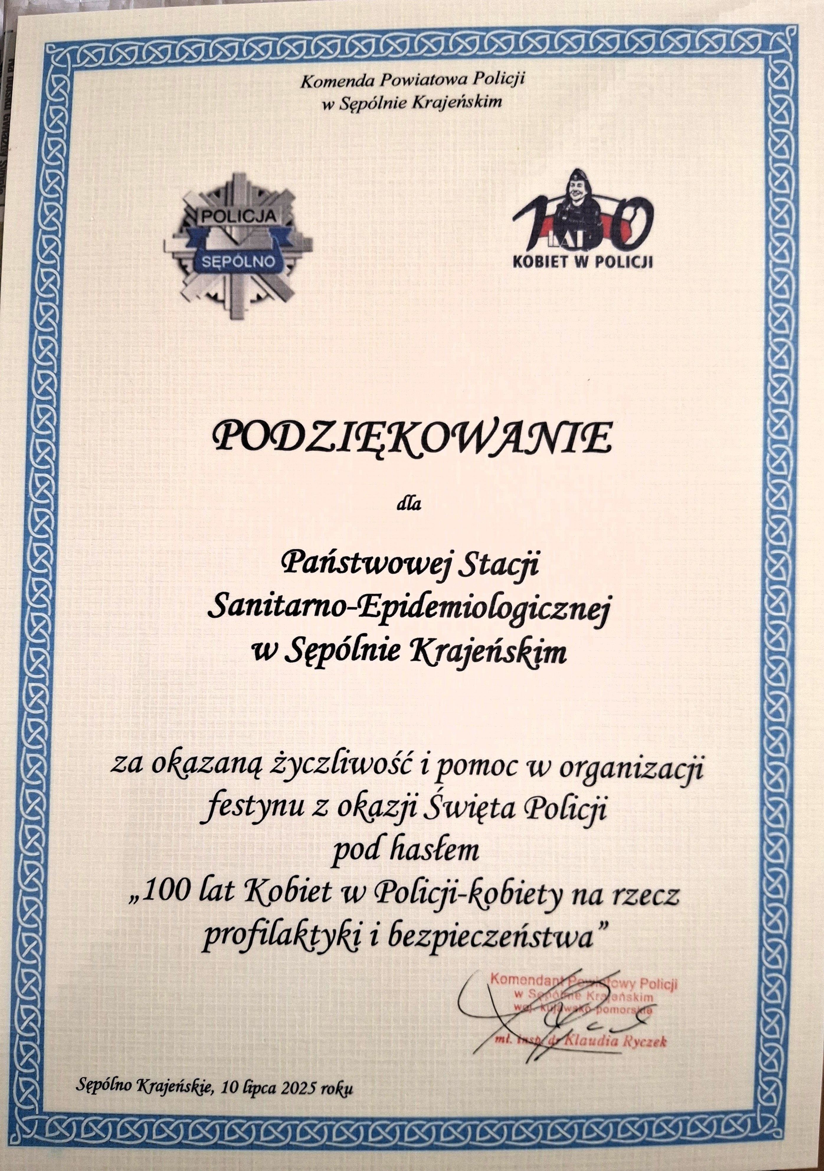 „100 lat Kobiet w Policji - kobiety na rzecz profilaktyki i bezpieczeństwa” - udział Państwowego Powiatowego Inspektora Sanitarnego w Sępólnie Kraj. w obchodach Święta Policji