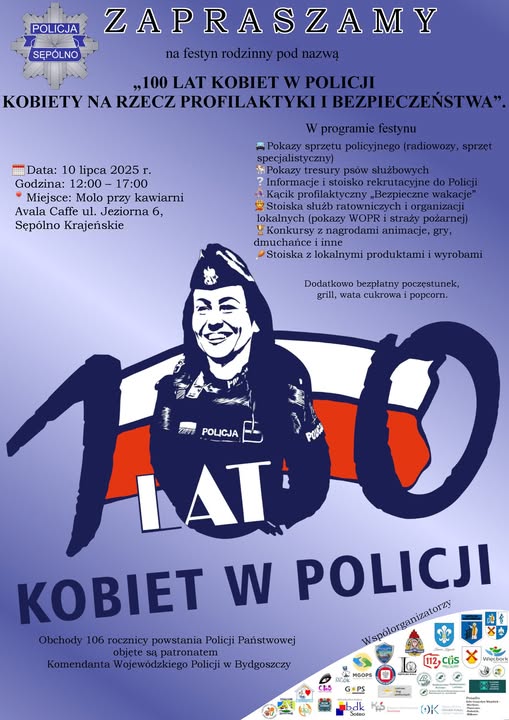 Pod hasłem „100 lat Kobiet w Policji – kobiety na rzecz profilaktyki i bezpieczeństwa” odbyły się dziś obchody Święta Policji w Sępólnie Krajeńskim, w których mieliśmy przyjemność uczestniczyć wspólnie z przedstawicielami służb, instytucji oraz lokalnej społeczności. Dzień był wypełniony po brzegi mnóstwem atrakcji – każdy mógł znaleźć coś dla siebie, zarówno dzieci, jak i dorośli.