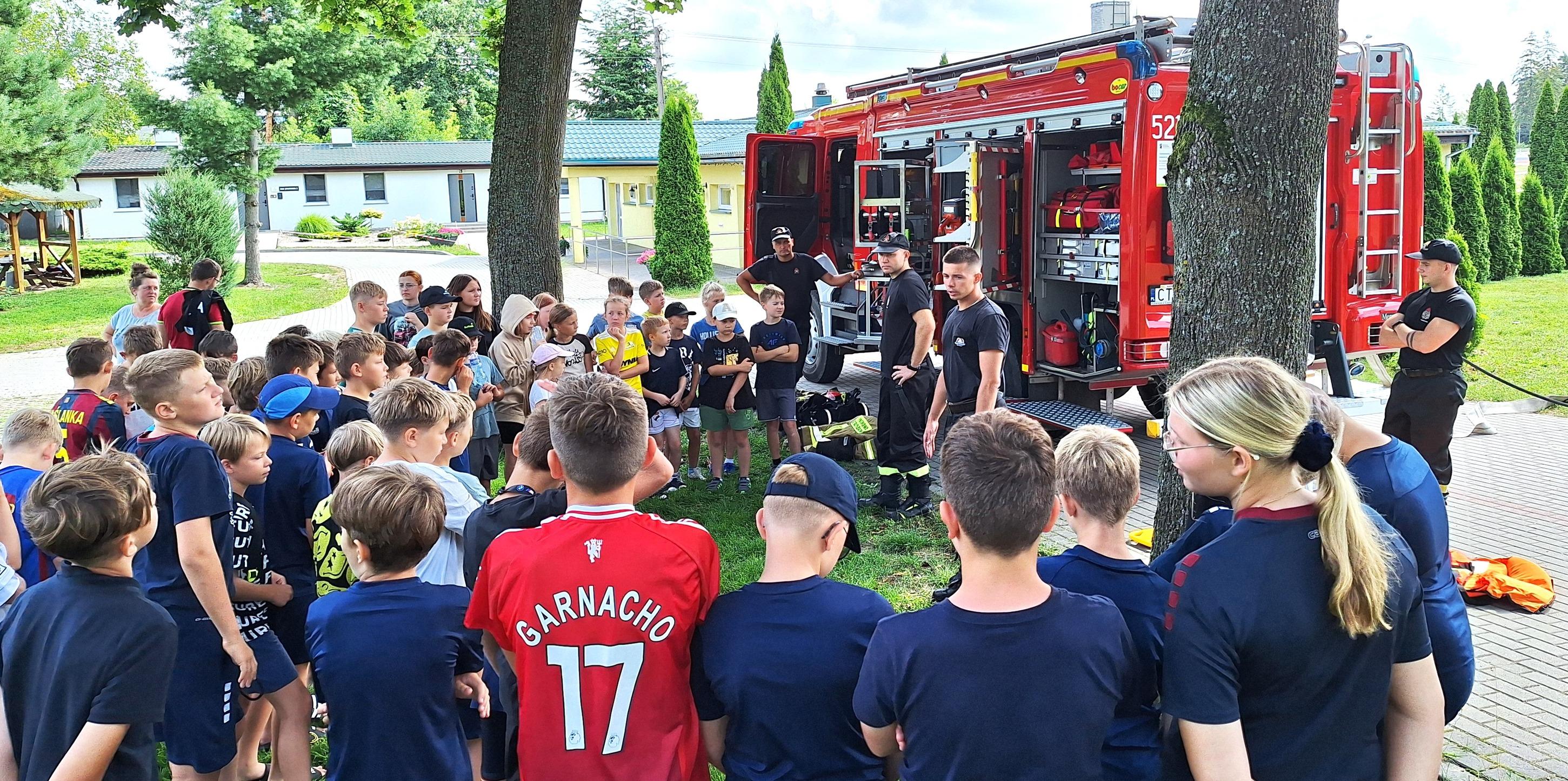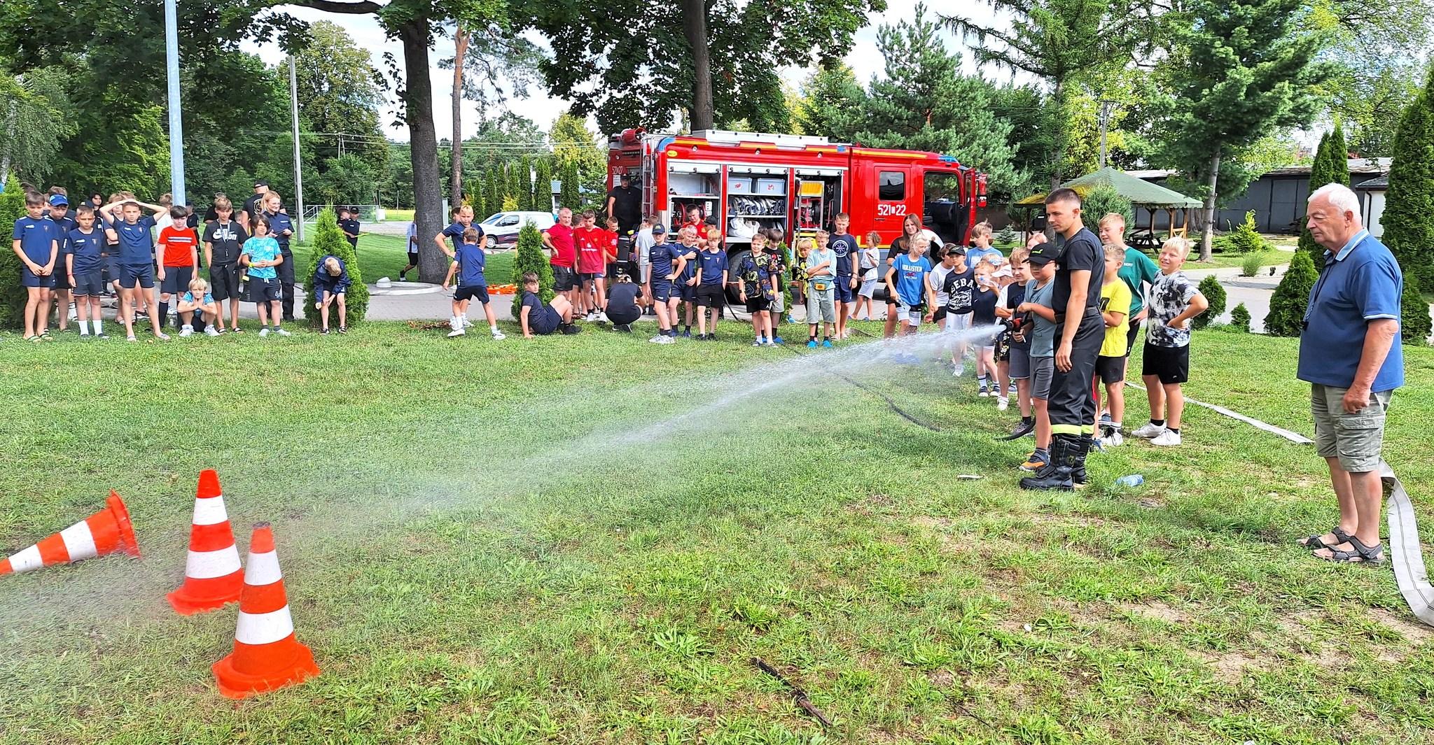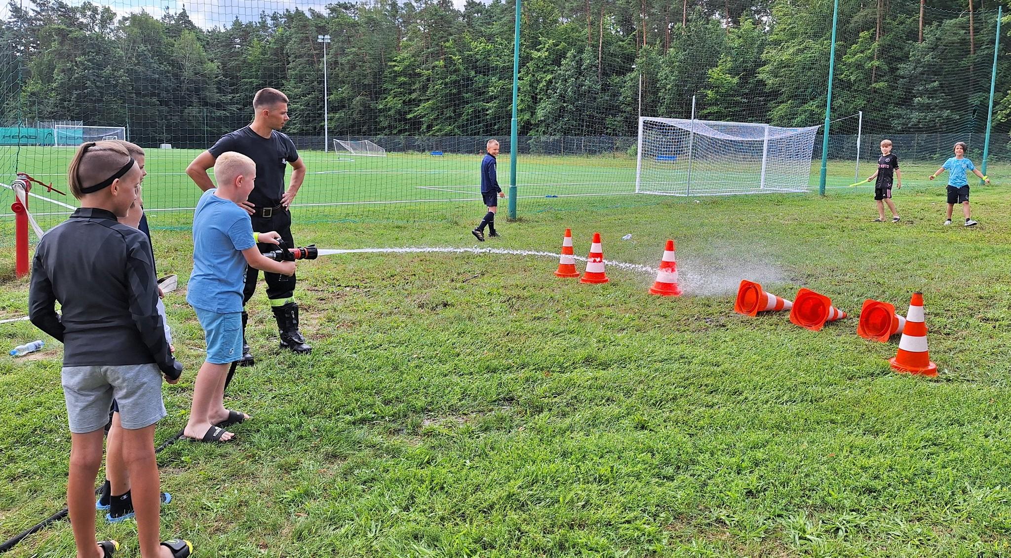 Na półmetku wakacji spotkaliśmy się z uczestnikami półkolonii oraz obozu sportowego piłki nożnej zorganizowanych w Centrum Sportu i Rekreacji w Sępólnie Krajeńskim. W trakcie spotkania rozmawialiśmy o szeroko rozumianym bezpieczeństwie podczas wakacji letnich, m.in. o sposobach ochrony zdrowia w trakcie upałów, profilaktyce ukąszeń przez kleszcze, a szczególnie o zasadach bezpiecznego wypoczynku nad wodą. Spotkanie było dodatkowo okazją do rozmów o specyfice pracy służb odpowiedzialnych za bezpieczeństwo oraz prezentacji wykorzystywanego sprzętu. Duża atrakcją była możliwość obejrzenia wyposażenia wozu strażackiego. Dodatkowo każdy uczestnik mógł na chwilę stać się strażakiem i użyć strażackiego węża. Osoby zainteresowane mogły posłuchać o pracy funkcjonariuszy Policji i wsiąść do policyjnego radiowozu. Pytań dotyczących pracy w służbach mundurowych nie było końca. Na zakończenie spotkania uczestnicy mieli możliwość ochłodzić się wodą z węża strażackiego.