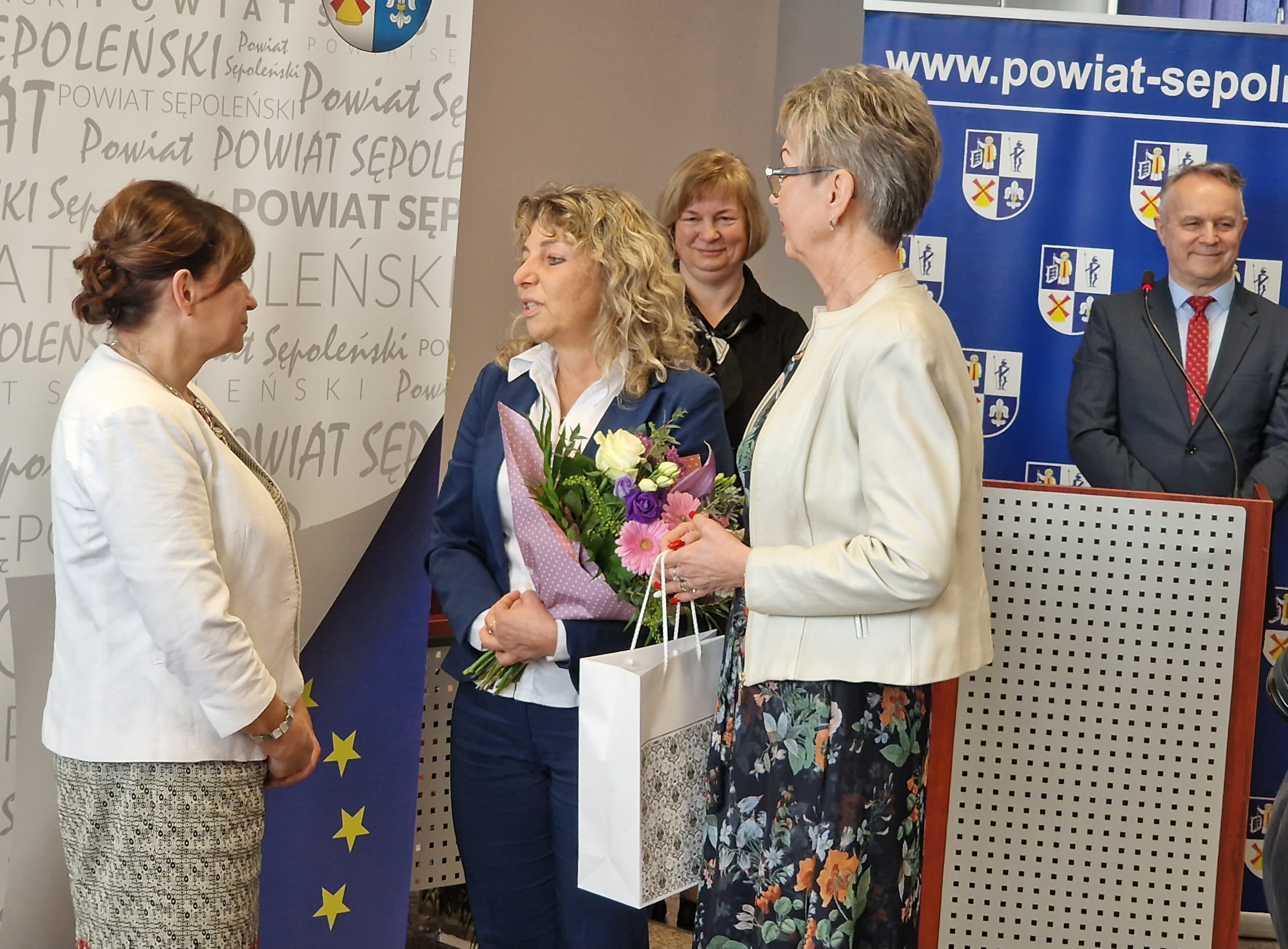 Podczas uroczystego spotkania, w obecności Starosty Sępoleńskiego, Pana Jarosława Tadycha, członków Zarządu Powiatu oraz samorządowców, Państwowy Wojewódzki Inspektor Sanitarny w Bydgoszczy, Pan Wojciech Koper podziękował Pani Elżbiecie Estkowskiej za lata pracy dla Państwowej Inspekcji Sanitarnej i życzył zasłużonego odpoczynku.