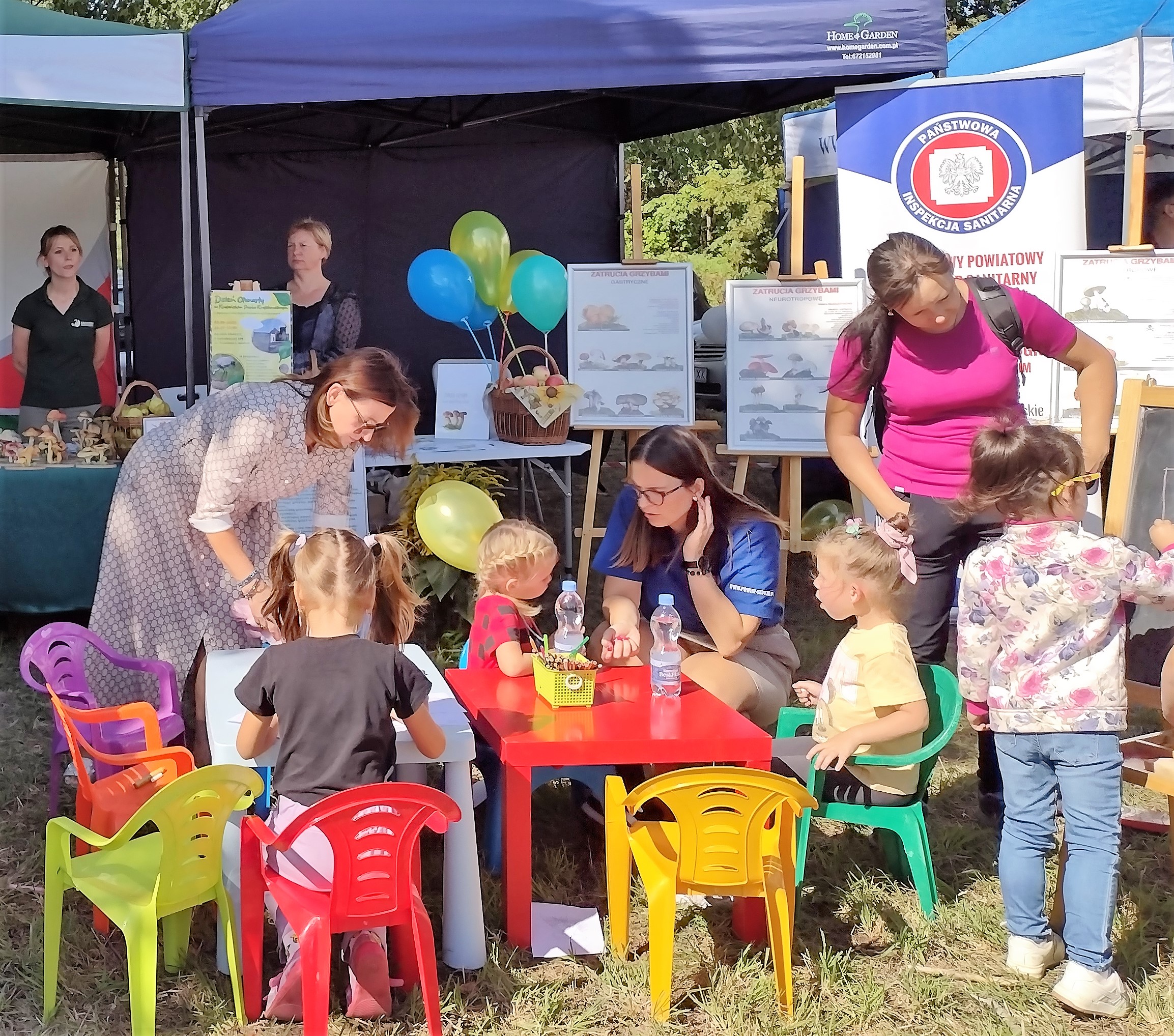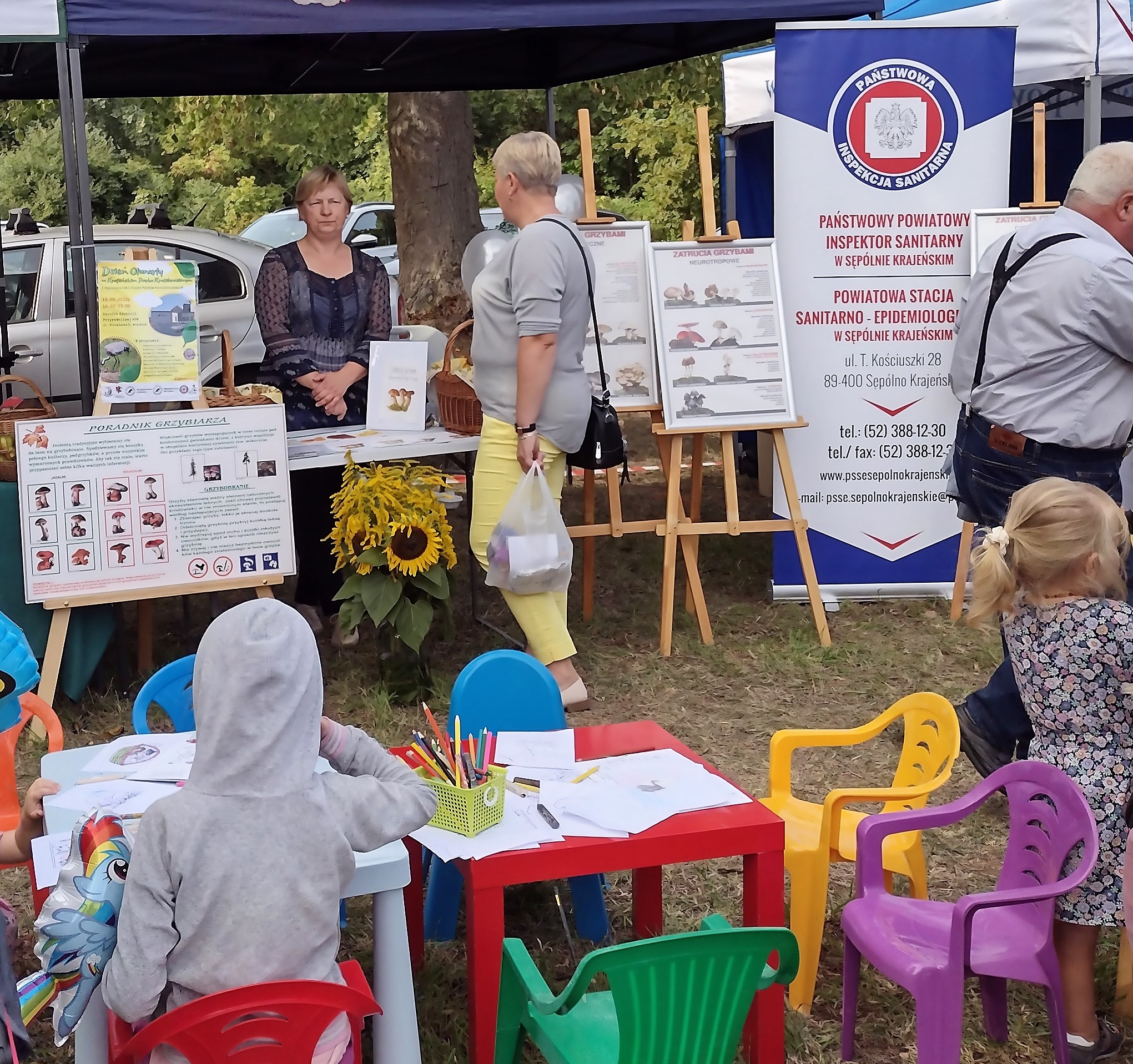 Przy stanowisku Stacji Sanitarno-Epidemiologicznej w Sępólnie Kraj. odwiedzający mogli zasięgnąć szereg informacji dotyczących profilaktyki zdrowotnej takich jak rola szczepień ochronnych, zasady zdrowego stylu życia czy też zagrożenia związane z ukąszeniem przez kleszcze. Trwający aktualnie sezon grzybobrania przyczynił się jednak do dużego zainteresowania zgromadzonych gości wystawą plakatów z gatunkami grzybów oraz modelami grzybów. Dla najmłodszych uczestników dożynek przygotowaliśmy konkursy i zabawy rysunkowe.