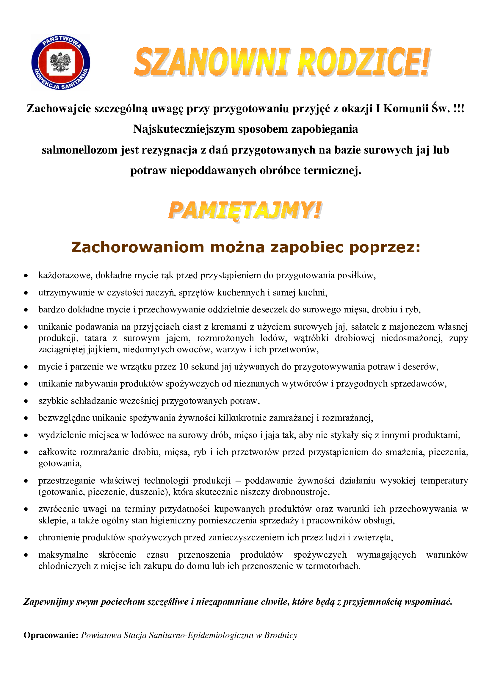 Trwa okres uroczystości komunijnych. Podczas przygotowywania poczęstunku należy pamiętać o pewnych zasadach, które pozwolą nam uniknąć zatruć pokarmowych. Państwowy Powiatowy Inspektor Sanitarny w Sępólnie Kraj. zwraca się z prośbą o zachowanie szczególnej ostrożności i dbałość o higienę w trakcie przygotowywania potraw podczas spotkań rodzinnych. Zakażenia pokarmowe mogą być szczególnie niebezpieczne dla niemowląt, małych dzieci, osób z upośledzoną odpornością oraz osób starszych.