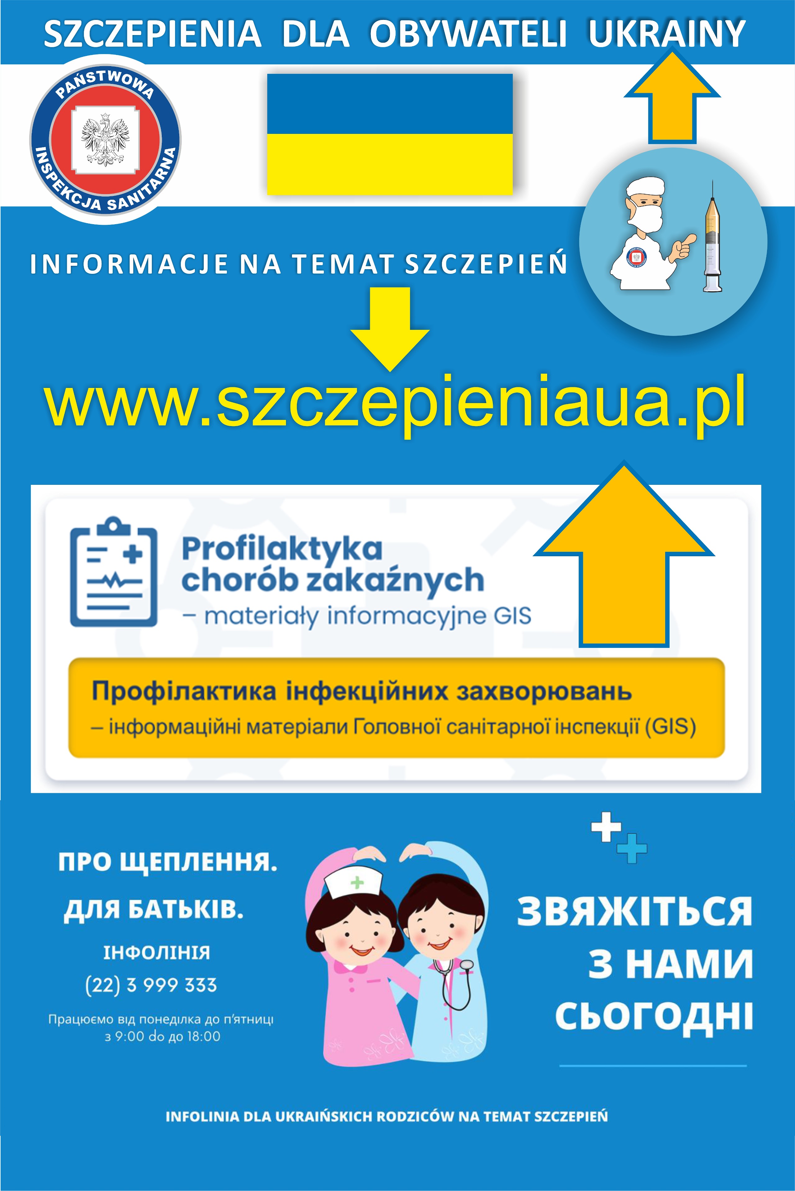 Informacje na temat szczepień oraz praw i obowiązków związanych ze szczepieniami ochronnymi ujętymi w polskim Programie Szczepień Ochronnych w języku ukraińskim dla opiekunów dzieci z Ukrainy dostępne są pod adresem www.szczepieniaua.pl. Specjalnie stworzona platforma helpdesku dla ukraińskich rodziców daje możliwość porozmawiania z ekspertami lub użycia live chat, który odpowiada na najczęściej zadawane pytania.