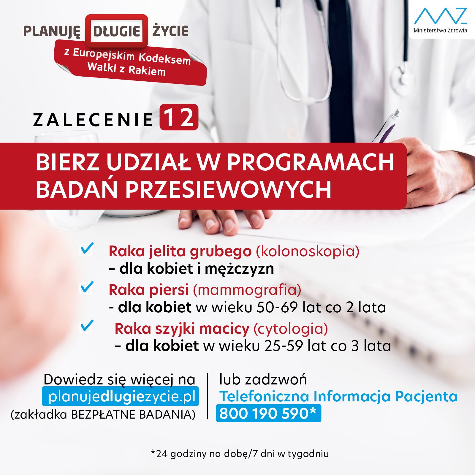 - Bierz udział w zorganizowanych programach badań przesiewowych w celu wczesnego wykrywania: raka jelita grubego (zalecenie dotyczy zarówno mężczyzn, jak i kobiet), raka piersi (u kobiet), raka szyjki macicy (u kobiet).