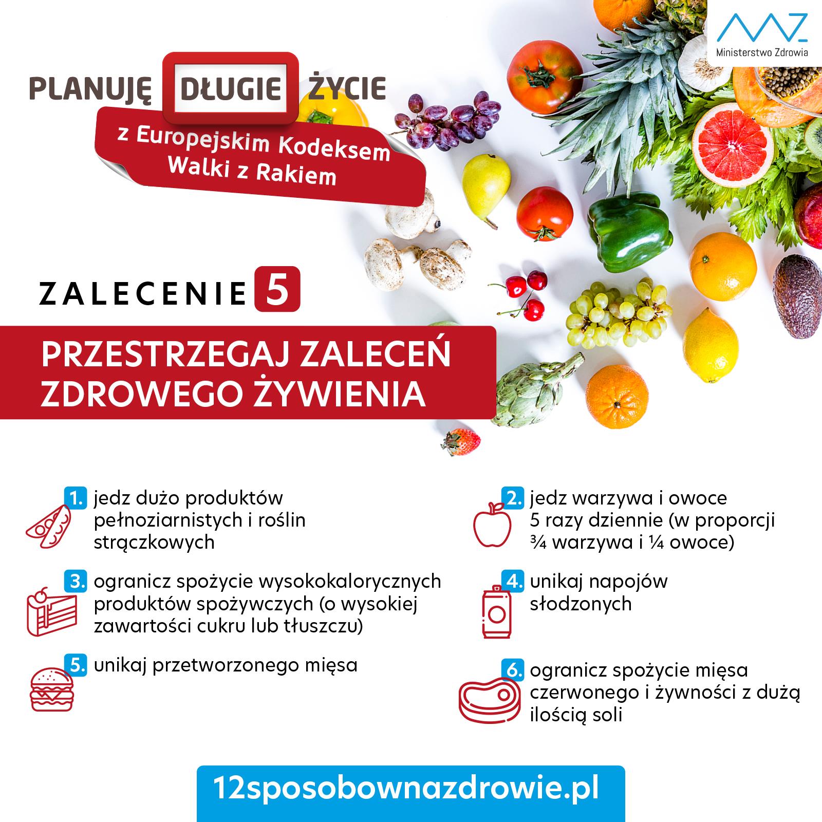 - Przestrzegaj zaleceń prawidłowego sposobu żywienia: jedz dużo produktów pełnoziarnistych, roślin strączkowych, warzyw i owoców, ogranicz spożycie wysokokalorycznych produktów spożywczych (o wysokiej zawartości cukru lub tłuszczu) i unikaj napojów słodzonych, unikaj przetworzonego mięsa; ogranicz spożycie mięsa czerwonego i żywności z dużą ilością soli.