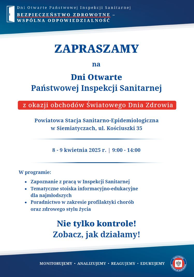 Z okazji Światowego Dnia Zdrowia serdecznie zapraszamy na Dni Otwarte Państwowej Inspekcji Sanitarnej w Siemiatyczach!