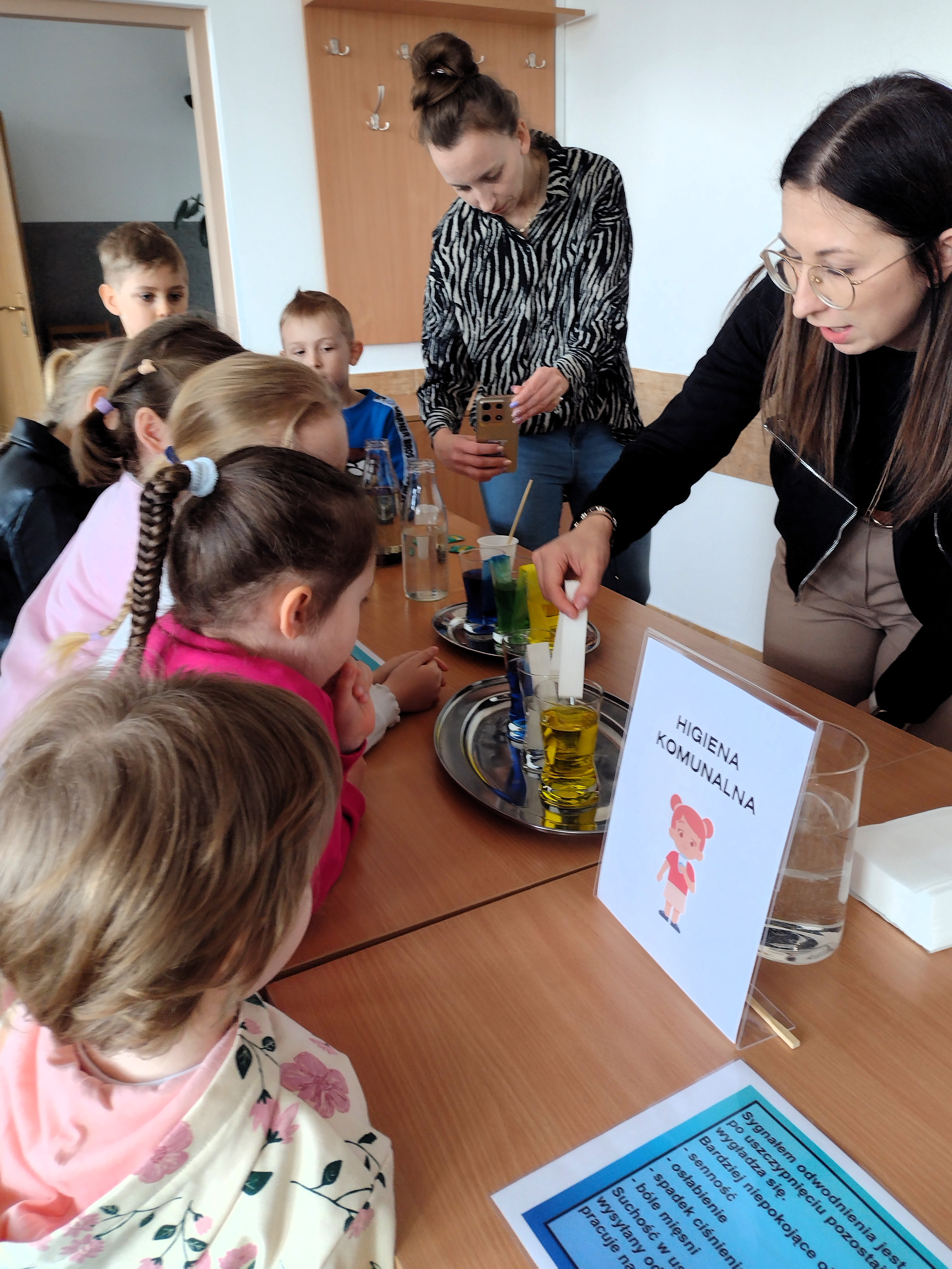 - Higiena Komunalna – zaprezentowano doświadczenie z wykorzystaniem wody, oleju, barwnika oraz tabletki musującej, pokazujące zachowanie różnych substancji i ich wzajemne oddziaływanie.