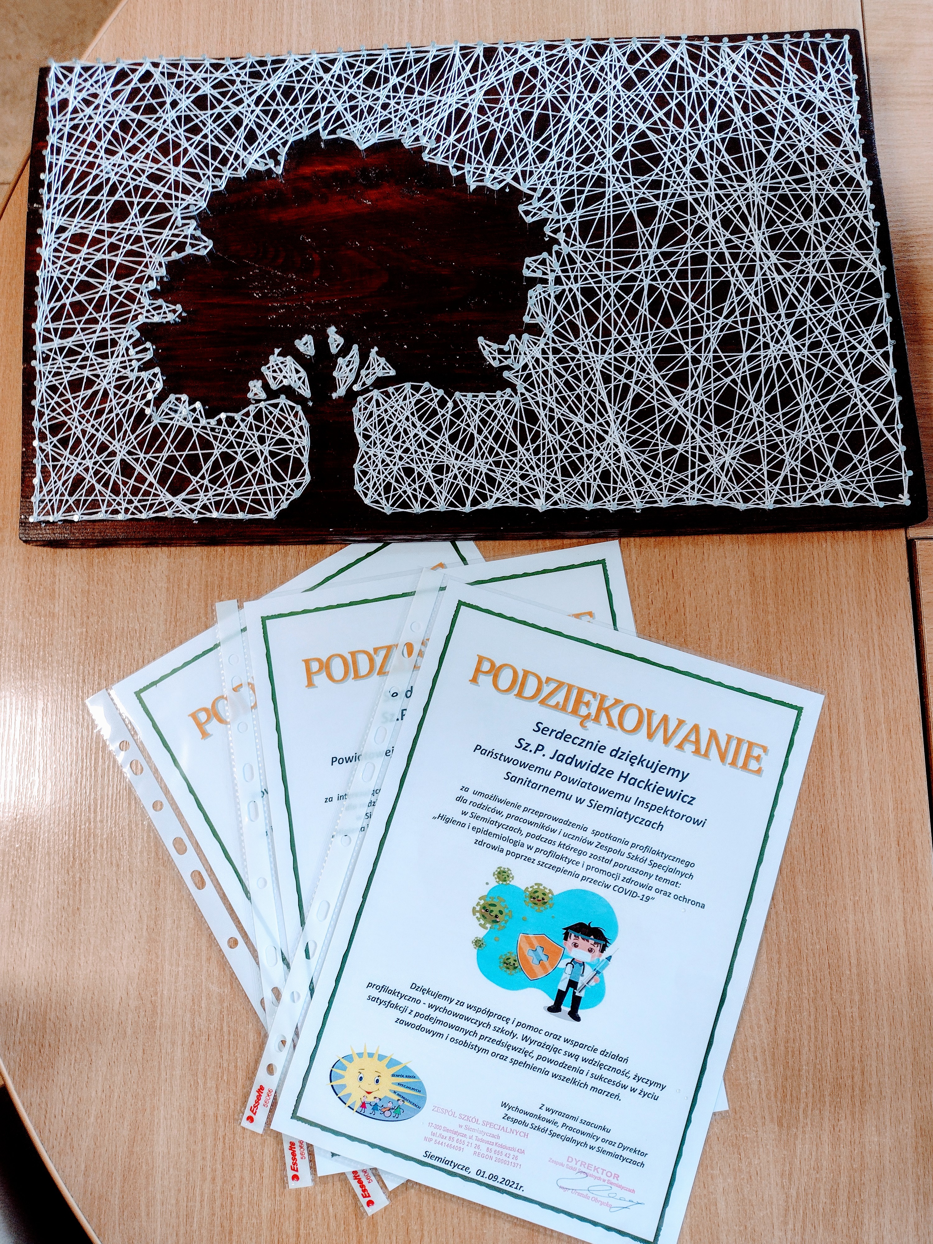 17.09.2021 r. dyrektor Zespołu Szkół Specjalnych w Siemiatyczach wraz z dziećmi i nauczycielami złożyli podziękowania na ręce Państwowego Powiatowego Inspektora Sanitarnego w Siemiatyczach, za zorganizowanie akcji informacyjno-edukacyjnej podczas spotkania z rodzicami w dniu 01.09.2021 r. Wszyscy podopieczni i nauczyciele w zamian za przybycie otrzymali drobny upominek.