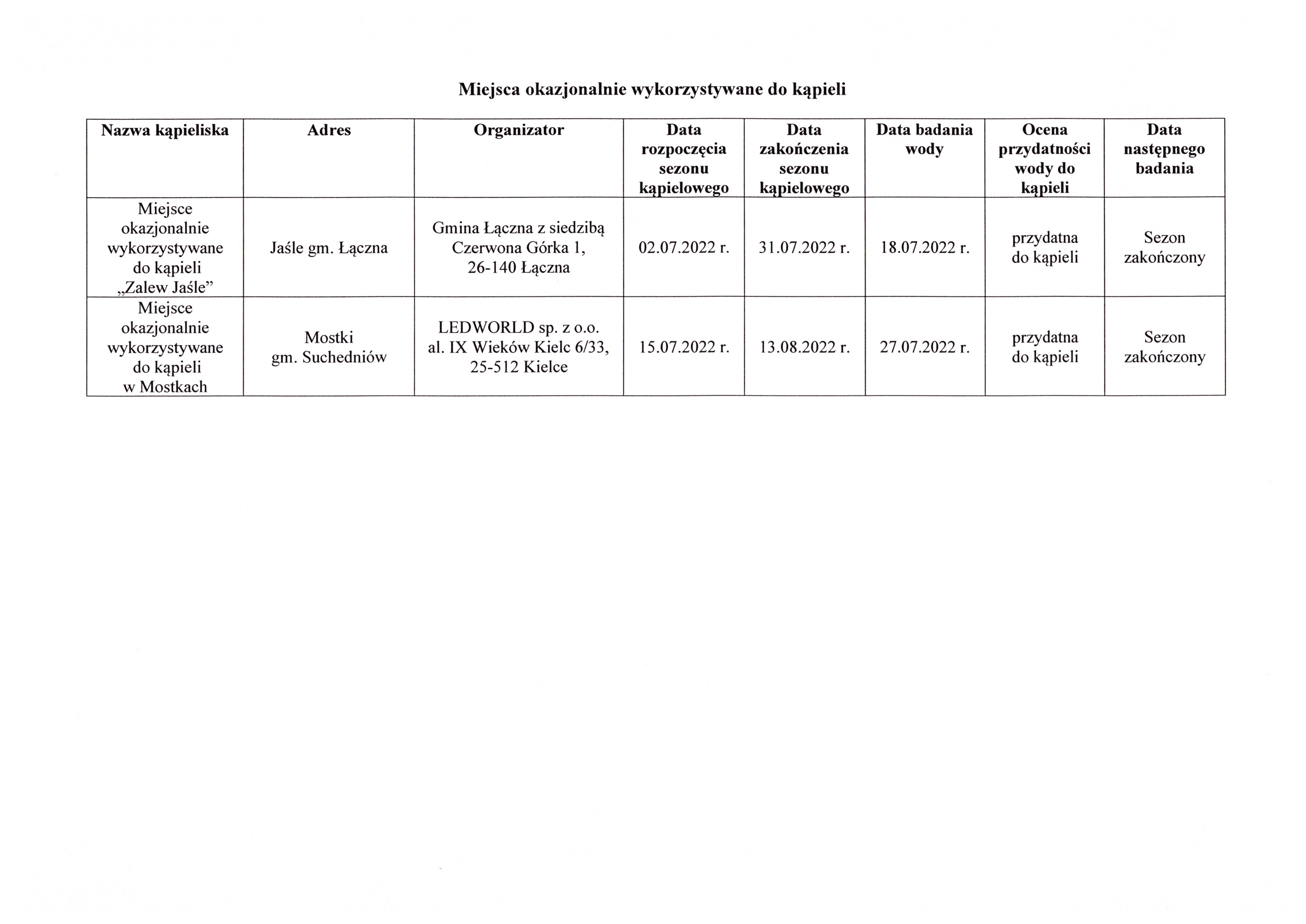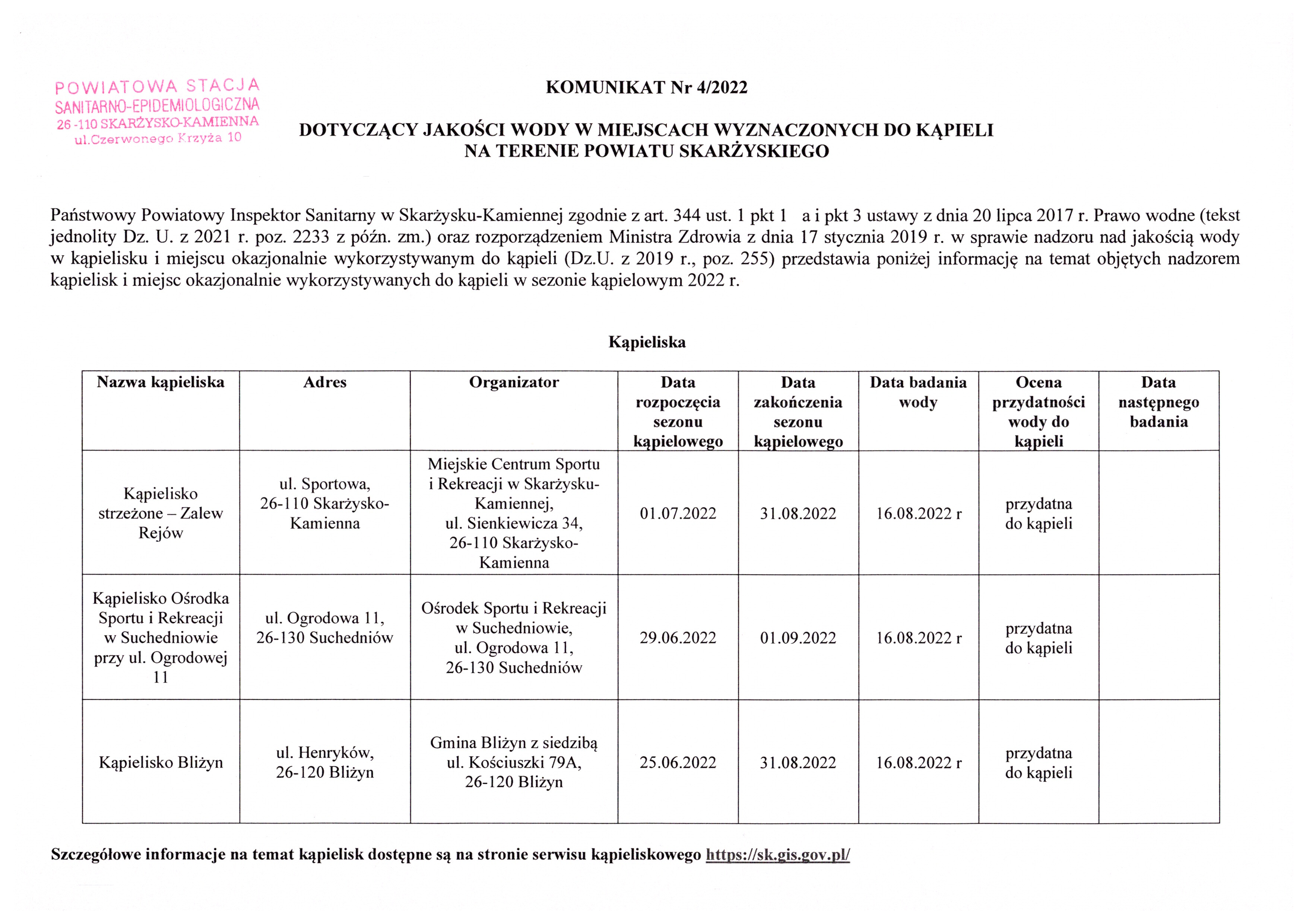 Państwowy Powiatowy Inspektor Sanitarny w Skarżysku-Kamiennej zgodnie z art. 344 ust. 1 pkt 1a i pkt 3 ustawy z dnia 20 lipca 2017 r. Prawo wodne (tekst jednolity Dz. U. z 2021 r. poz. 2233 z późn. zm.) oraz rozporządzeniem Ministra Zdrowia z dnia 17 stycznia 2019 r. w sprawie nadzoru nad jakością wody w kąpielisku i miejscu okazjonalnie wykorzystywanym do kąpieli (Dz.U. z 2019 r., poz. 255) przedstawia poniżej informację na temat objętych nadzorem kąpielisk i miejsc okazjonalnie wykorzystywanych do kąpieli w sezonie kąpielowym 2022 r.