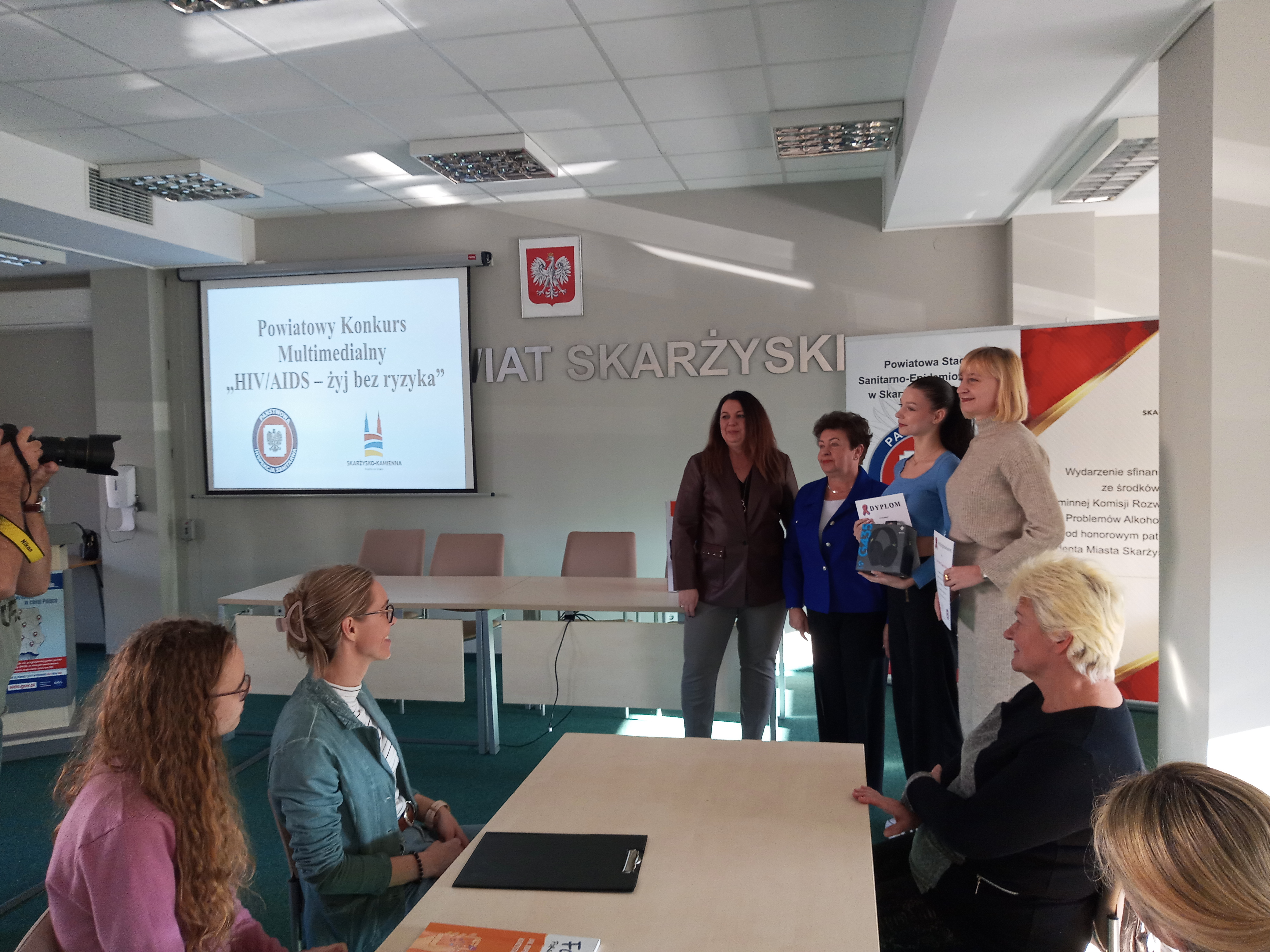 W drugiej części spotkania nastąpiło rozstrzygniecie Powiatowego Konkursu Multimedialnego „HIV/AIDS – żyj bez ryzyka” zorganizowanego przez Państwowego Powiatowego Inspektora Sanitarnego w Skarżysku-Kamiennej we współpracy z Urzędem Miasta w Skarżysku-Kamiennej. Uczestnikami konkursu byli uczniowie klas VII-VIII szkół podstawowych oraz uczniowie szkół ponadpodstawowych z terenu powiatu skarżyskiego. Celem konkursu było podniesienie świadomości młodych ludzi oraz ich wiedzy temat HIV i AIDS oraz sposobów ochrony przed zakażeniem wirusem; uświadomienie, że zagrożenie HIV może dotyczyć każdego z nas; podniesienie poziomu akceptacji i tolerancji dla osób żyjących z HIV i chorych na AIDS; kształtowanie świadomości młodzieży na temat konsekwencji wynikających z ryzykownych zachowań zdrowotnych oraz zwiększenie odpowiedzialności za własne życie.