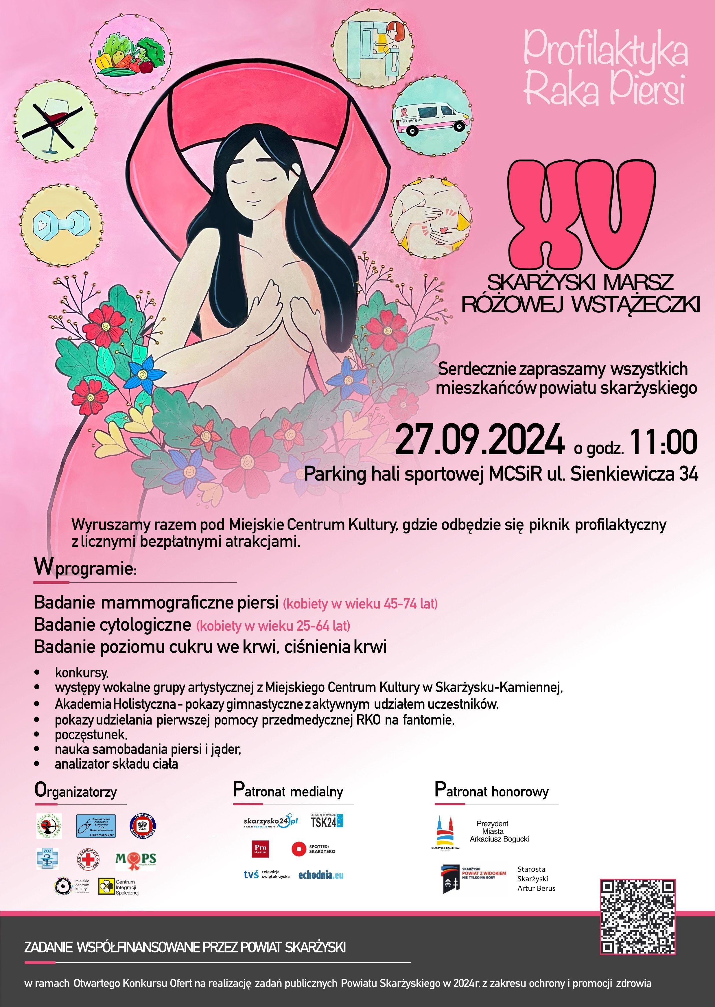 Serdecznie zapraszamy do wzięcia udziału w XV Skarżyskim Marszu Różowej Wstążeczki, który odbędzie się 27 września 2024 r. Rozpoczęcie zaplanowano na godzinę 11.00 na Parkingu Hali Sportowej MCSiR w Skarżysku-Kamiennej ul. Sienkiewicza 34, następnie przemarsz ulicami miasta na Plac Staffa pod Miejskie Centrum Kultury, gdzie odbędzie się piknik profilaktyczny z licznymi atrakcjami.