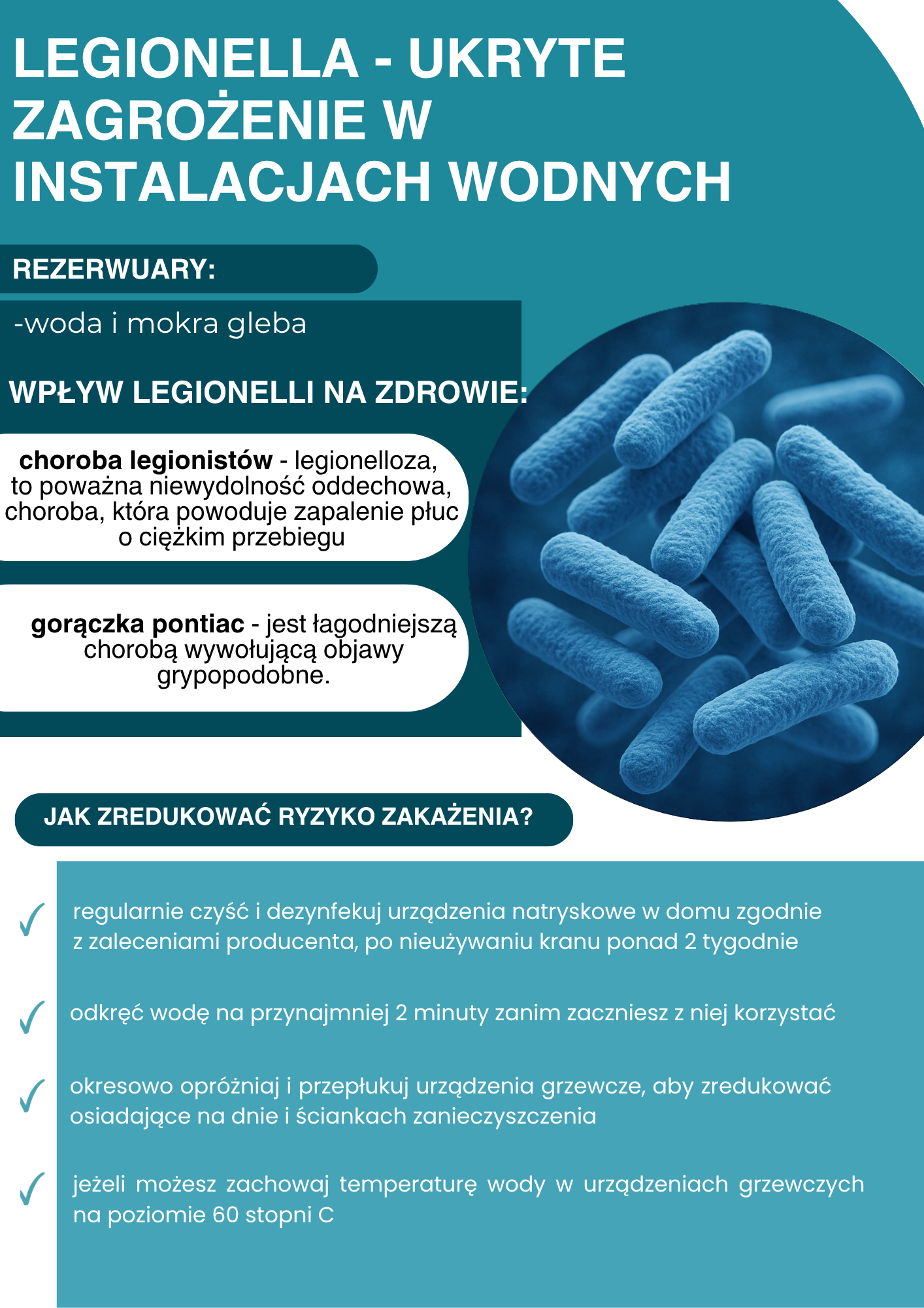 Legionella to groźna bakteria rozwijająca się w instalacjach wodnych, zwłaszcza w ciepłej wodzie. Może prowadzić do poważnych chorób układu oddechowego, w tym niebezpiecznej legionellozy (choroby legionistów).