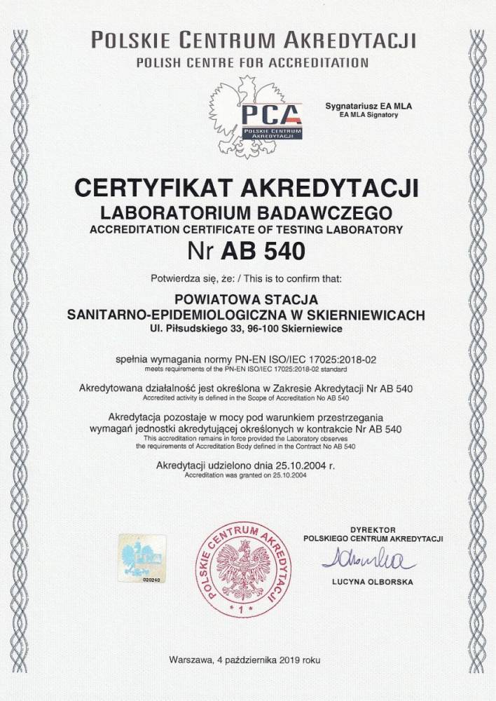 Oddział Laboratoryjny Powiatowej Stacji Sanitarno-Epidemiologicznej w Skierniewicach utrzymuje i doskonali wdrożony, wspomagający działalność laboratoryjną System Zarządzania zgodny z normą PN-EN ISO/IEC 17025:2018-2 „Ogólne wymagania dotyczące kompetencji laboratoriów badawczych i wzorcujących”.