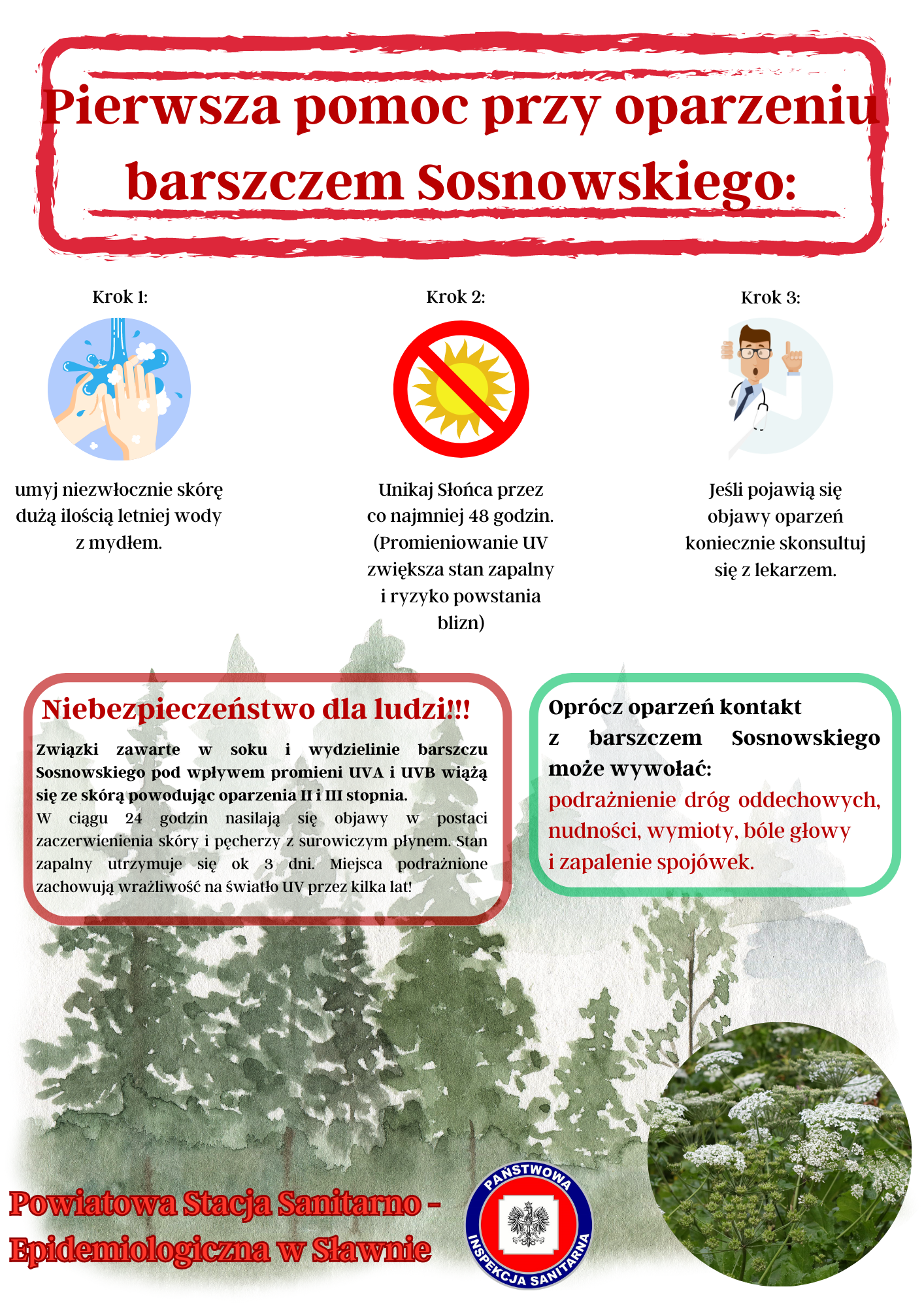 Barszcz Sosnowskiego to inwazyjna roślina, występująca na terenie całej Polski. Kontakt z nią jest groźny dla zdrowia, a nawet życia człowieka. Barszcz Sosnowskiego osiąga wysokość do 4m, charakteryzuje się białym kwiatostanem i wielkimi liśćmi, przez co często mylony jest z wyrośniętym koprem włoskim lub arcydzięglem. Na łodygach i liściach ma włoski produkujące toksyczną substancję.