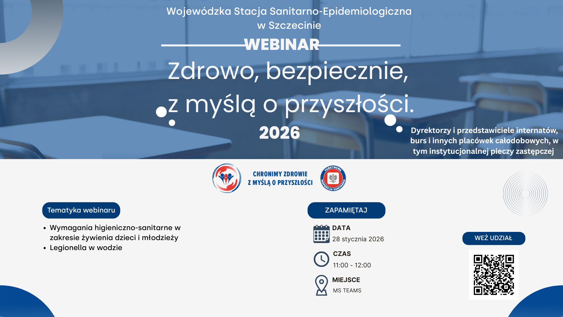 Państwowy Powiatowy Inspektor Sanitarny w Sławnie zaprasza dyrektorów i przedstawicieli linternatów, burs i innych placówek całodobowych, w tym instytucjonalnej pieczy zastępczej, do udziału w webinarze, organizowanym przez Wojewódzką Stację Sanitarno-Epidemiologiczną w Szczecinie.