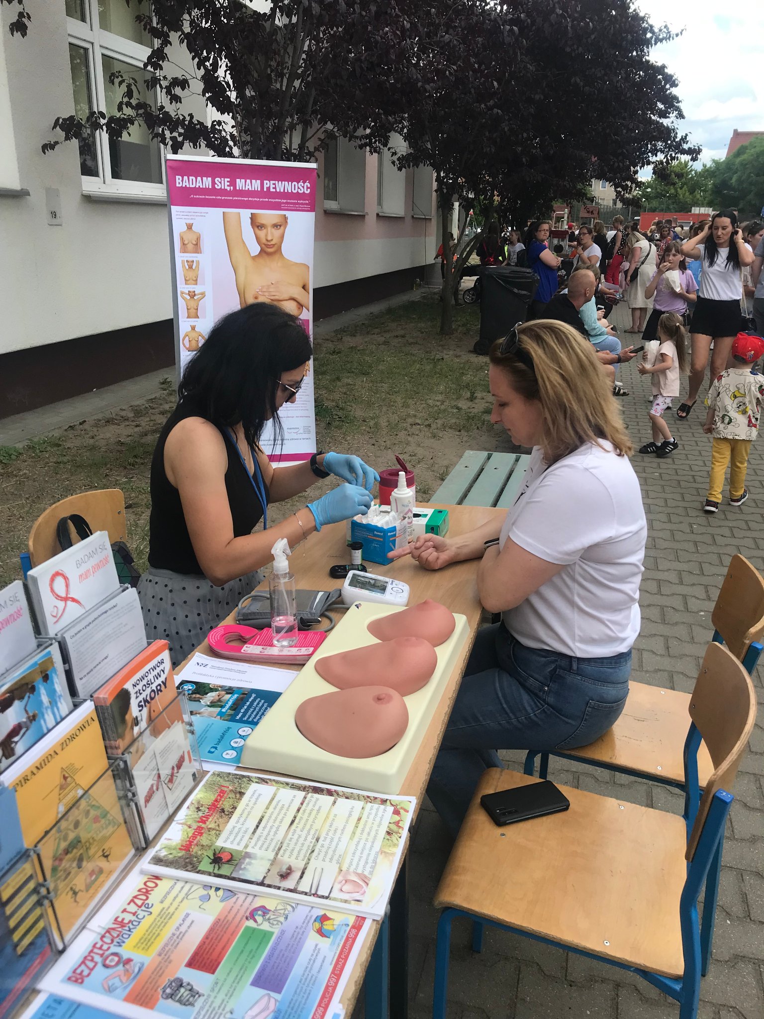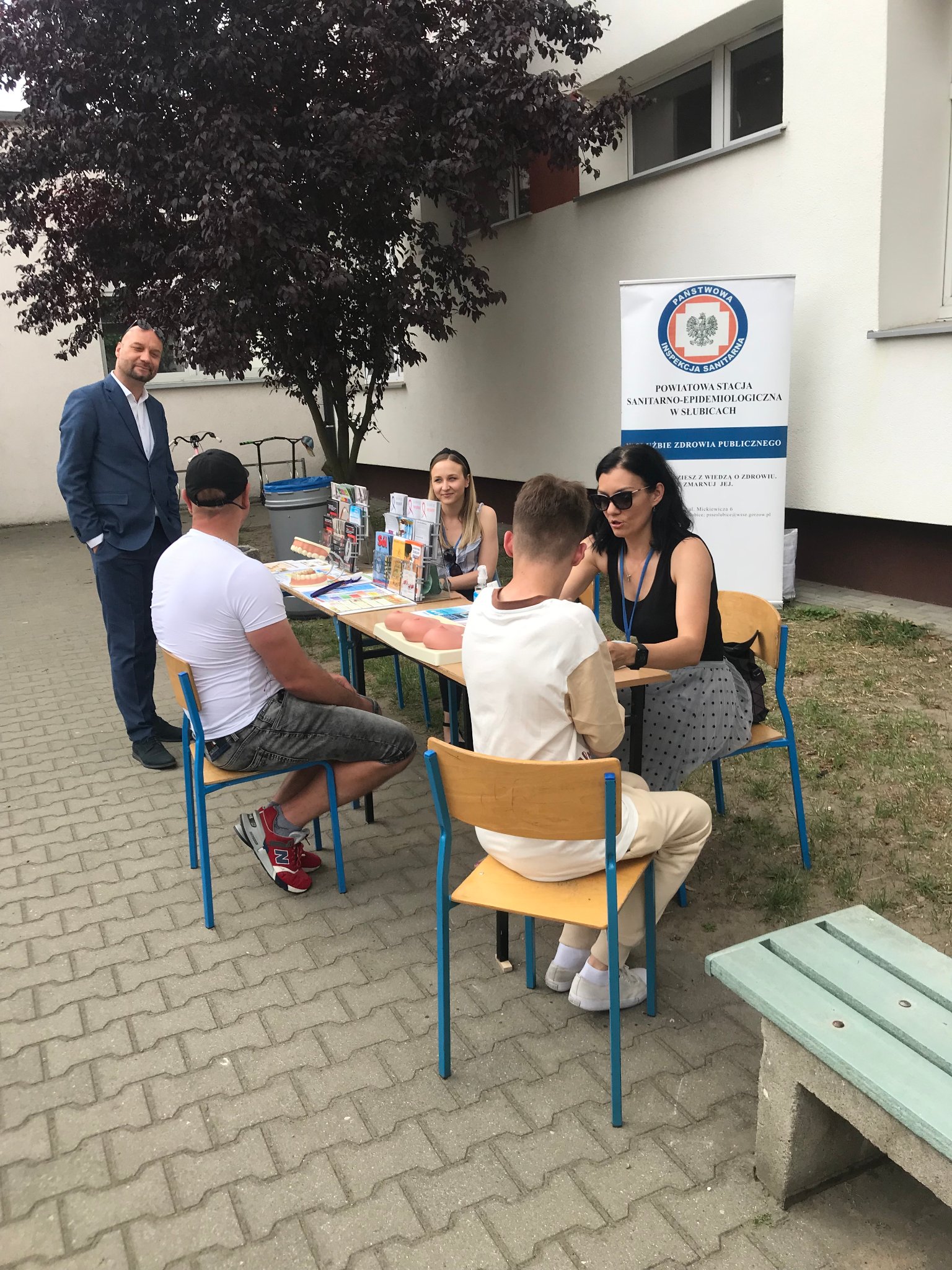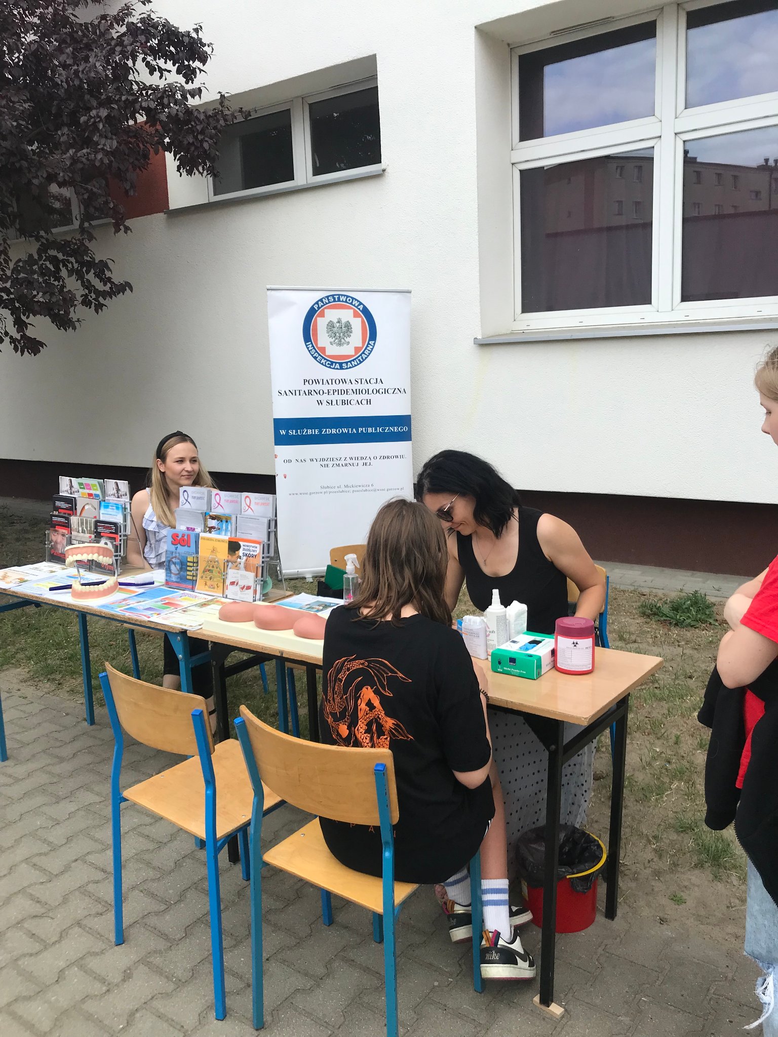 Pod czujnym okiem naszego Inspektora prowadziłyśmy Punkt Promocji Zdrowia podczas festynu rodzinnego w szkole podstawowej nr 1 w Słubicach. Impreza odbyła się 8 czerwca. W naszym punkcie starałyśmy się nawiązać do profilaktyki nowotworów w ramach trwających od 4 do 24 Dni Walki z Rakiem, zainteresowanym udzielałyśmy instruktażu samobadania na fantomach. Zbliżają się wakacje, więc ważnym tematem było bezpieczeństwo podczas letniego wypoczynku. Rozmawiałyśmy z odwiedzającymi o rozsądnym korzystaniu ze słonecznej pogody, ochrony przed kleszczami, bezpiecznych kąpieliskach, bezpieczeństwie podczas wycieczek i uprawiania sportu. Nieodzownym elementem naszego punktu jest pomiar ciśnienia tętniczego oraz glukozy we krwi, młodsze dzieci chętnie pokazują jak myją ząbki, przy okazji poruszamy tematy związane ze zdrowym trybem życia, zdrowym odżywianiem i higieną, dzięki którym możemy uniknąć zatruć pokarmowych. Podczas festynu szkoła zapewniła wiele atrakcji, a dzięki wsparciu rodziców stoły „uginały się” od zdrowych przekąsek. Było nam bardzo miło uczestniczyć w tym festynie.
