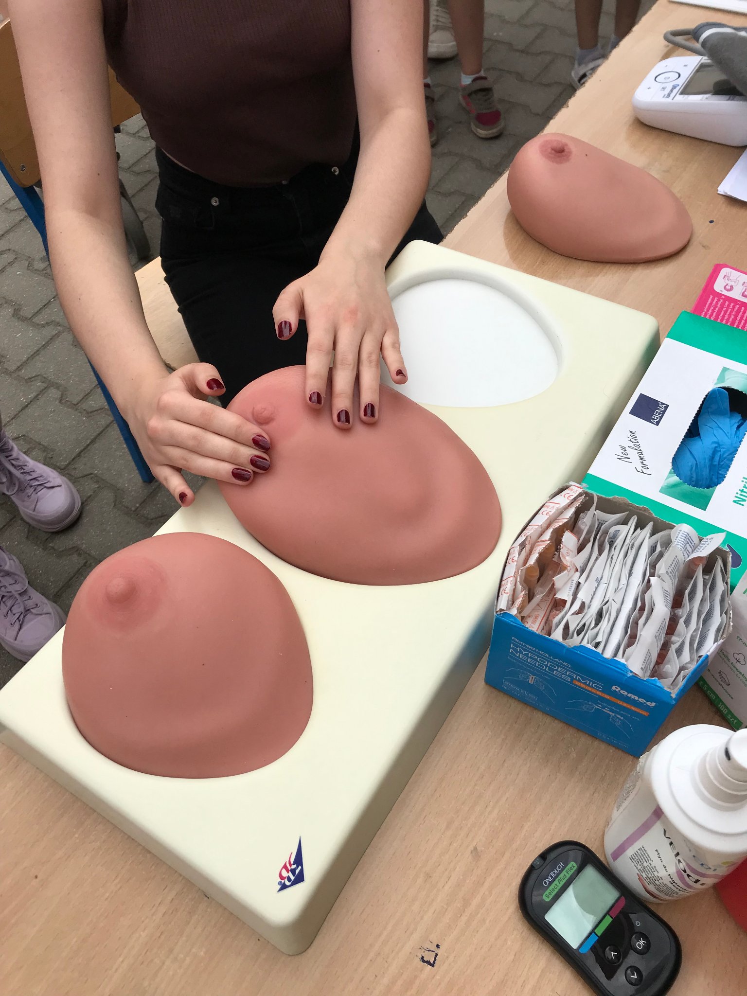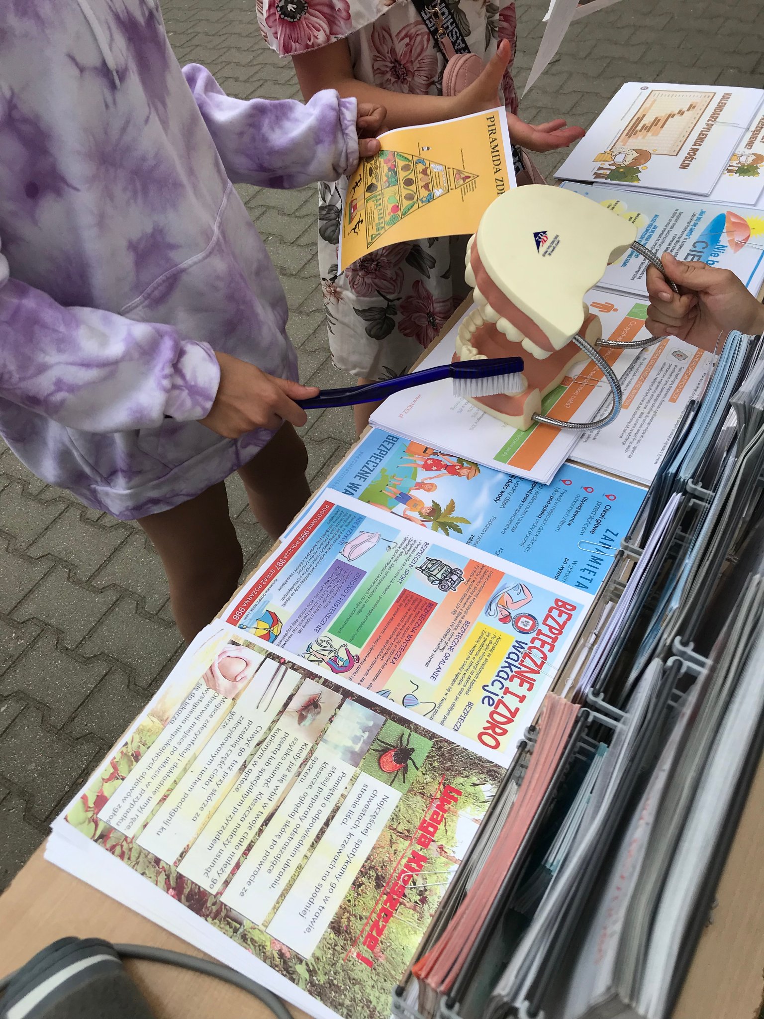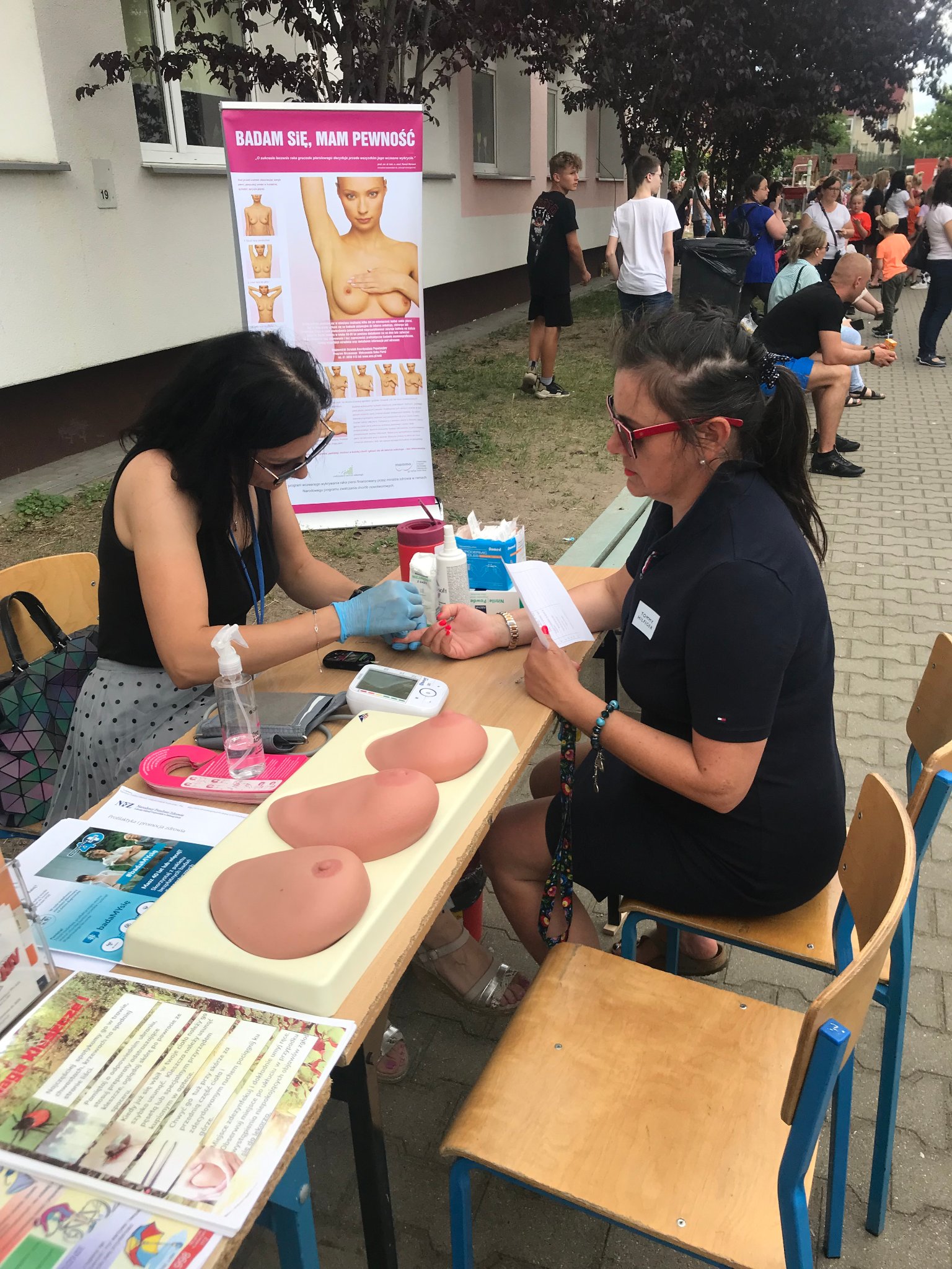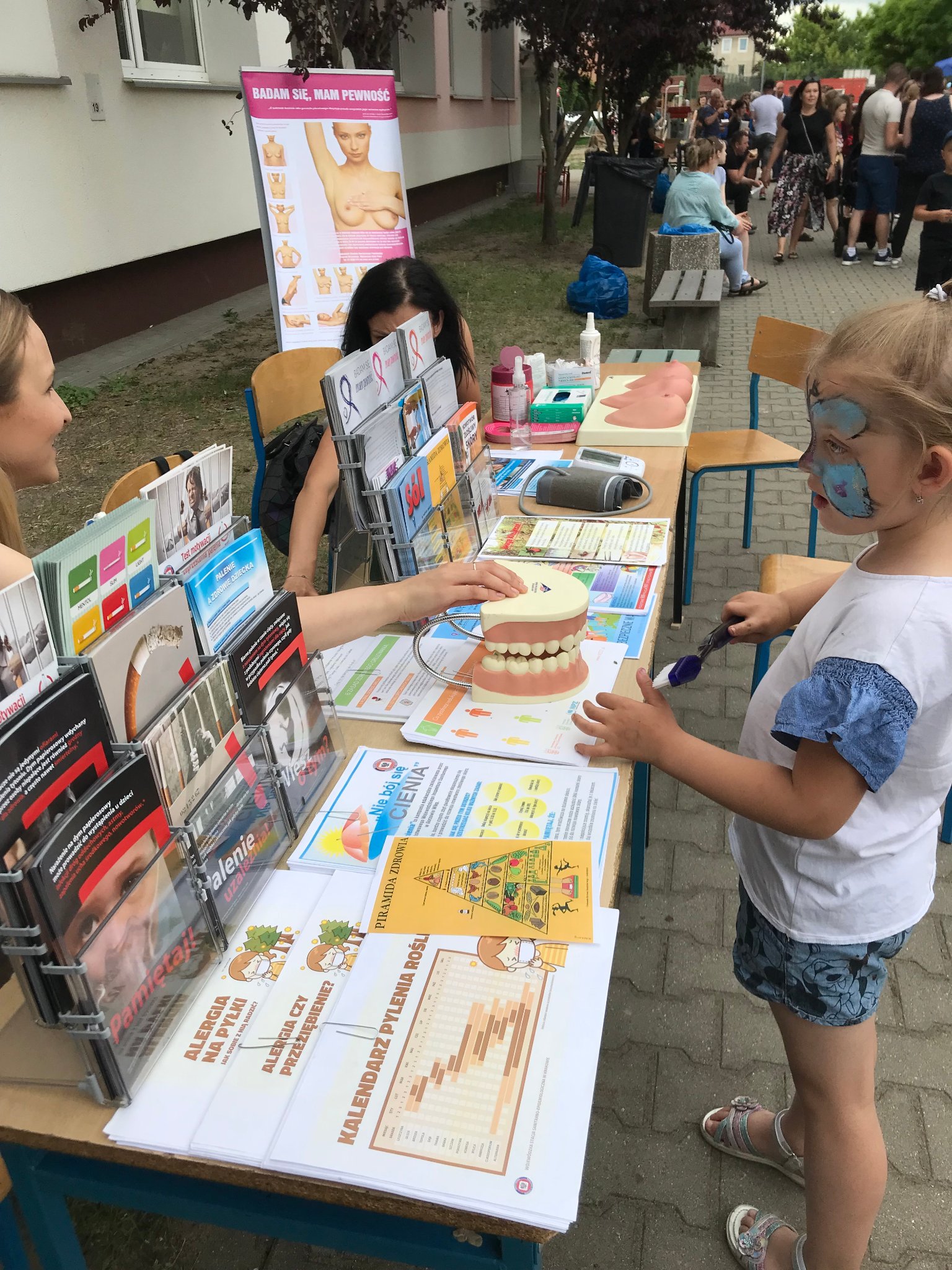 Pod czujnym okiem naszego Inspektora prowadziłyśmy Punkt Promocji Zdrowia podczas festynu rodzinnego w szkole podstawowej nr 1 w Słubicach. Impreza odbyła się 8 czerwca. W naszym punkcie starałyśmy się nawiązać do profilaktyki nowotworów w ramach trwających od 4 do 24 Dni Walki z Rakiem, zainteresowanym udzielałyśmy instruktażu samobadania na fantomach. Zbliżają się wakacje, więc ważnym tematem było bezpieczeństwo podczas letniego wypoczynku. Rozmawiałyśmy z odwiedzającymi o rozsądnym korzystaniu ze słonecznej pogody, ochrony przed kleszczami, bezpiecznych kąpieliskach, bezpieczeństwie podczas wycieczek i uprawiania sportu. Nieodzownym elementem naszego punktu jest pomiar ciśnienia tętniczego oraz glukozy we krwi, młodsze dzieci chętnie pokazują jak myją ząbki, przy okazji poruszamy tematy związane ze zdrowym trybem życia, zdrowym odżywianiem i higieną, dzięki którym możemy uniknąć zatruć pokarmowych. Podczas festynu szkoła zapewniła wiele atrakcji, a dzięki wsparciu rodziców stoły „uginały się” od zdrowych przekąsek. Było nam bardzo miło uczestniczyć w tym festynie.