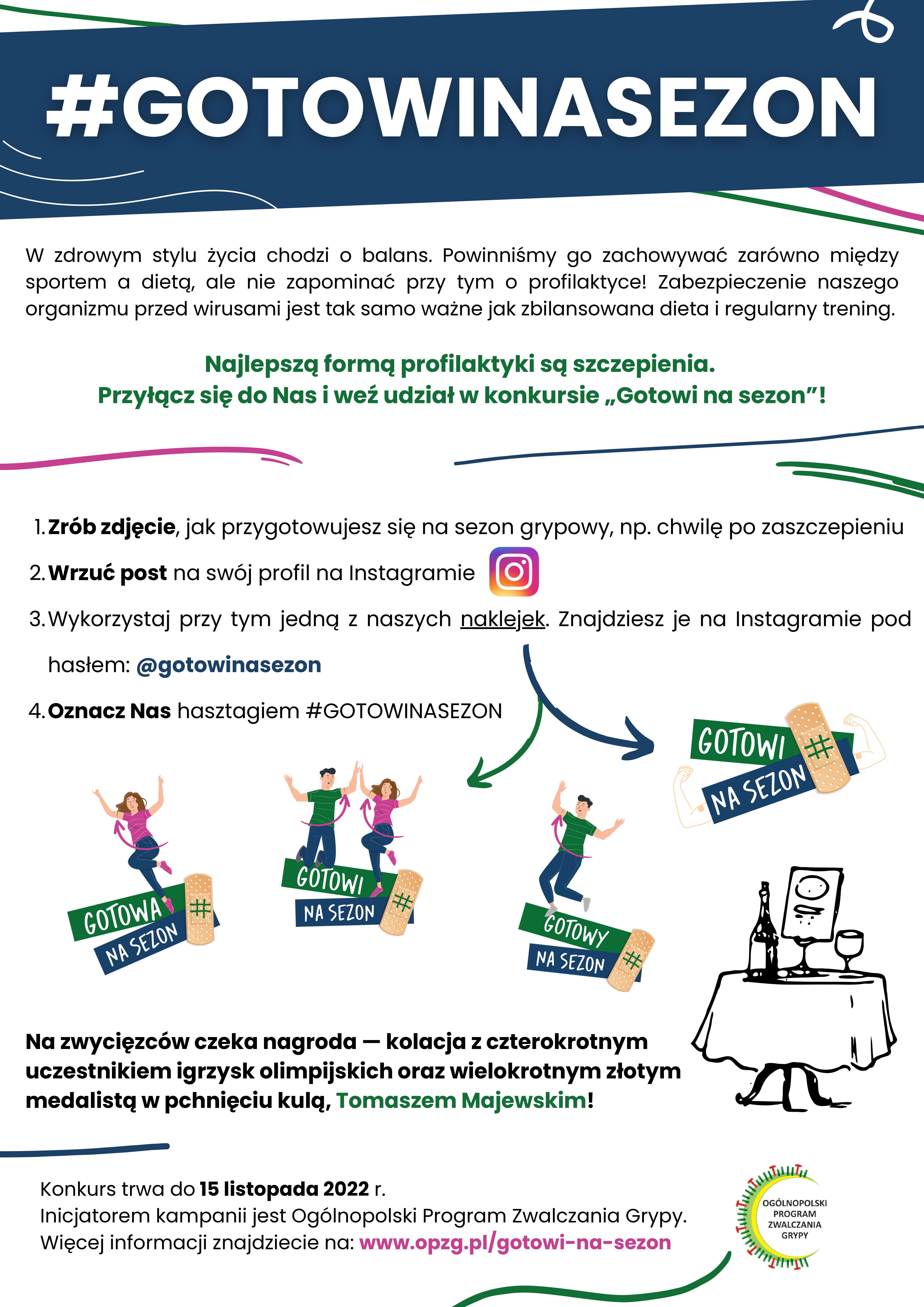 #GOTOWINASEZON to kampania społeczna zainicjowana przez Ogólnopolski Program zwalczania grypy, której celem jest zachęcenie Polaków do zaszczepienia się przeciwko grypie w obecnym sezonie 2022/2023. Grypa sezonowa to globalny problem zdrowia publicznego, który jest obciążeniem ekonomicznym dla całego społeczeństwa. Z powodu tej choroby co minutę na świecie umiera jedna osoba. Światowa Organizacja Zdrowia (WHO) mówi wprost, że najlepszym sposobem walki z wirusem i ochrony najbardziej narażonych na powikłania pogrypowe są szczepienia profilaktyczne. W ramach kampanii zachęcamy do udziału w konkursie., którego szczegóły znajdują się poniżej