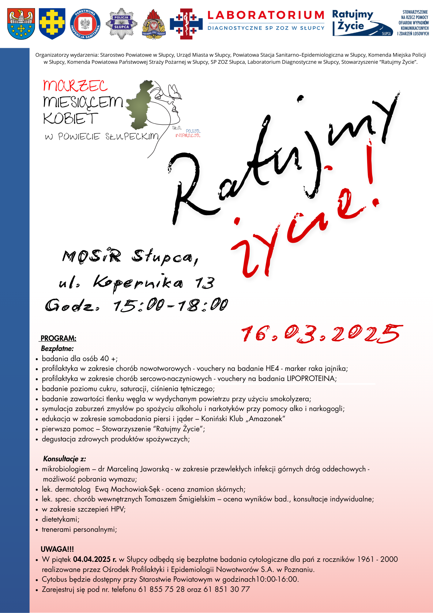 Organizatorzy wydarzenia: Powiatowa Stacja Sanitarno–Epidemiologiczna w Słupcy, Starosta Słupecki, Burmistrz Miasta Słupcy, Dyrekcja Szpitala oraz Prezes „Stowarzyszenia Ratujmy Życie” - serdecznie zapraszają.