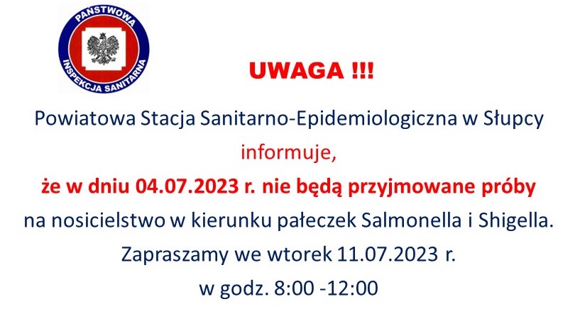 Informujemy, że w dniu 04.07.2023 r. próbki kału do badań w kierunku nosicielstwa pałeczek Salmonella/Shigella (do celów sanitarno-epidemiologicznych) nie będą przyjmowane.