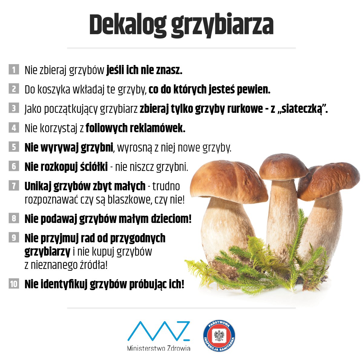 Zbieranie grzybów wymaga wiedzy oraz doświadczenia. Zbieraj grzyby, co, do których masz całkowitą pewność. Jeżeli masz wątpliwości, nie ryzykuj, porównaj swoje zbiory z atlasem grzybów lub przynieś grzyby do Sanepidu.