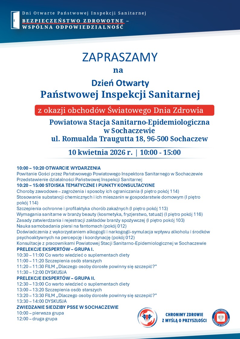 Serdecznie zapraszamy na Dzień Otwarty Państwowej Inspekcji Sanitarnej z okazji obchodów Światowego Dnia Zdrowia w Powiatowej Stacji Sanitarno-Epidemiologicznej w Sochaczewie
