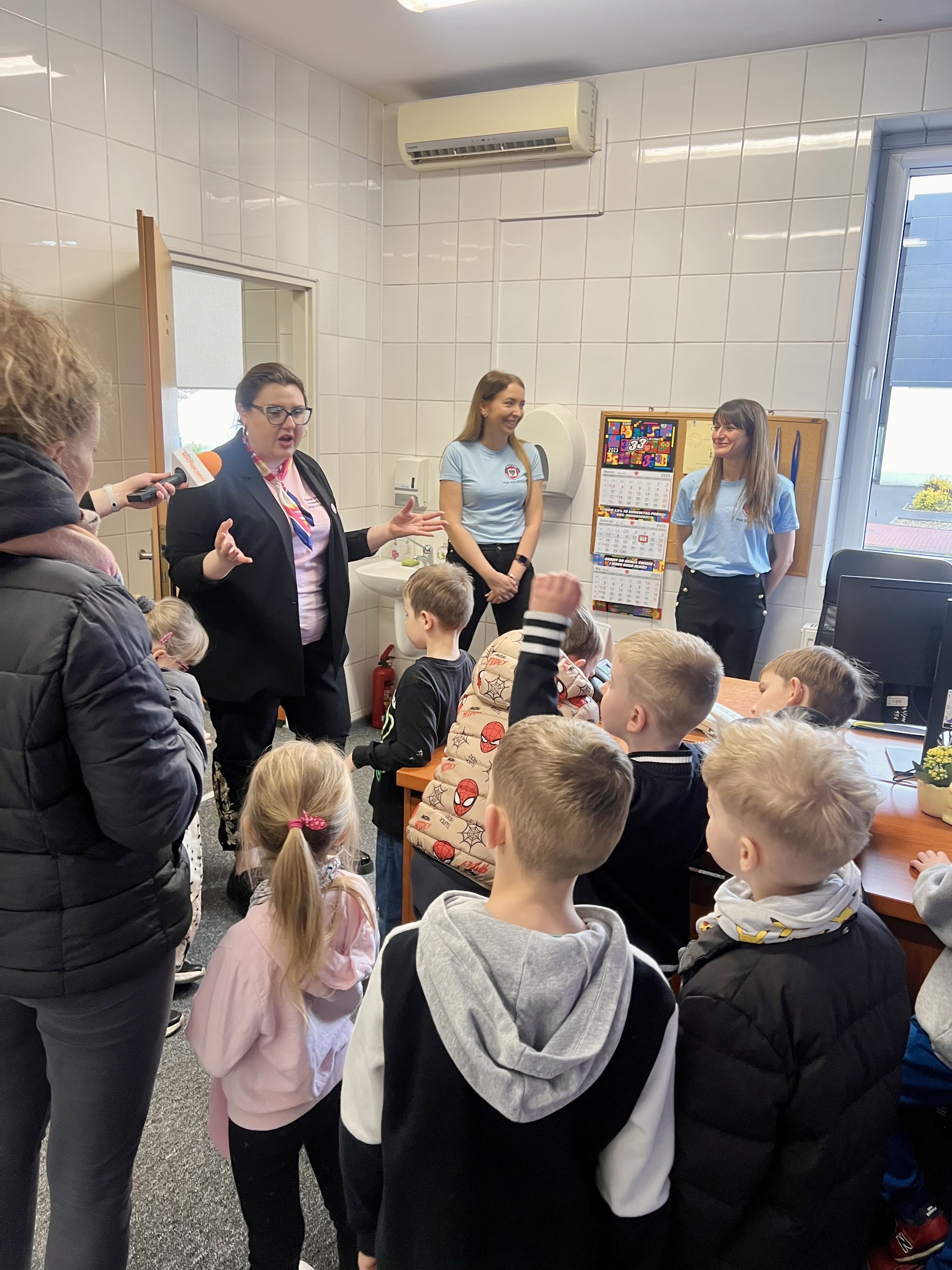 Szczególnym momentem wydarzenia była wizyta seniorki, starszej pani, która… urodziła się w 1943 roku w piwnicy domu stojącego tuż obok obecnej siedziby Sanepidu. Pani podzieliła się niezwykle cennymi wspomnieniami z dzieciństwa – opowiadała, jak biegała z innymi dziećmi po obecnym budynku stacji, wspominała lokalizację dawnych łaźni, w których – jak zaznaczyła – na parterze znajdowały się cztery wanny, ponieważ w tamtych czasach niewiele osób miało łazienki w domach. Pamiętała także niemieckich lekarzy, którzy przyjmowali w działającej wówczas przychodni. Jej opowieść wniosła niesamowitą wartość do wydarzenia i pozwoliła wszystkim spojrzeć na budynek Sanepidu w zupełnie nowym świetle – jako miejsce pełne historii i wspomnień pokoleń.