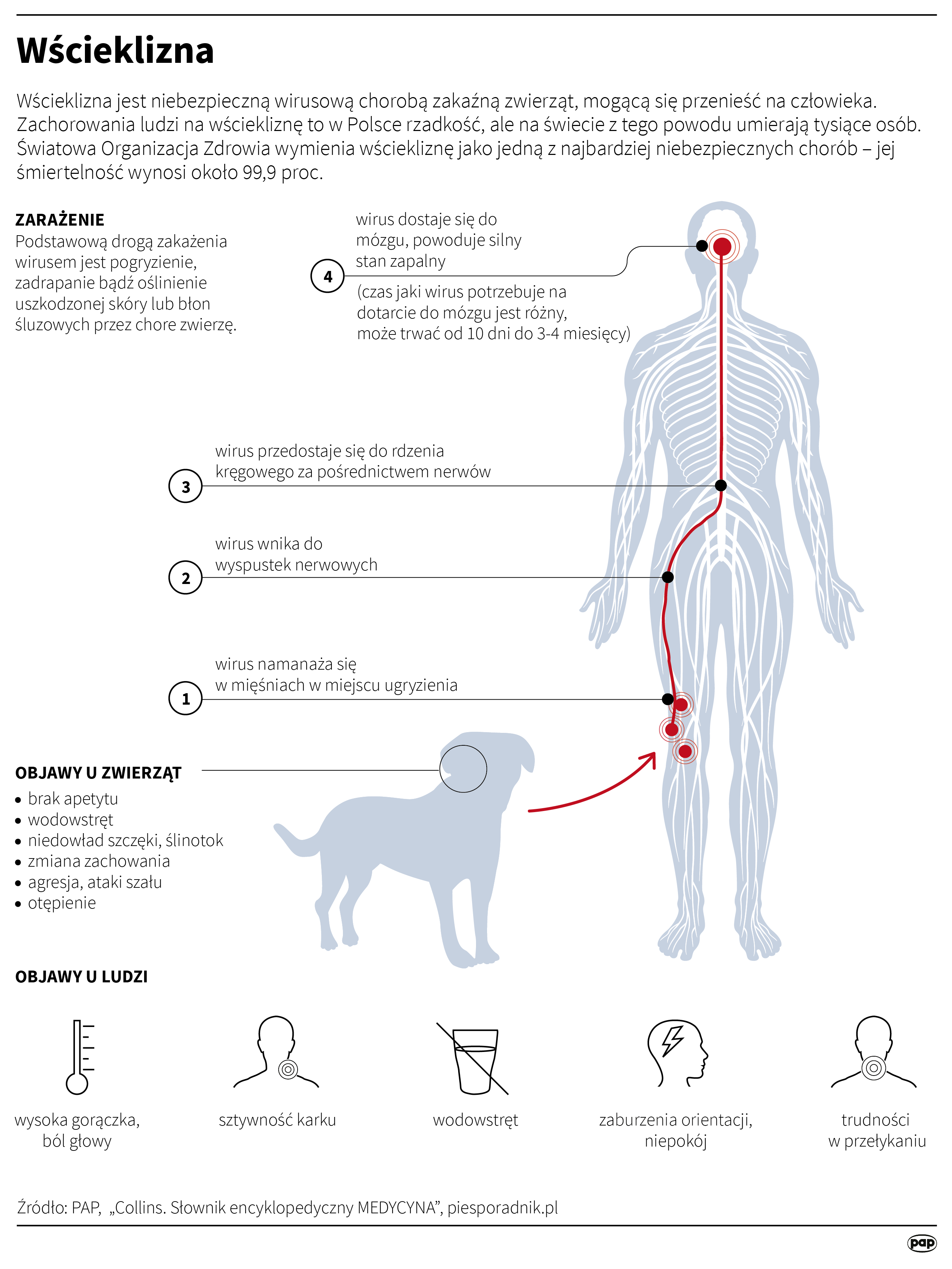 Ważny fakt – okres inkubacji trwać może 3-8 tygodni (lub dłużej), a po nim pojawiają się niespecyficzne objawy, tj. bóle głowy, gorączka, nudności, niepokój, podniecenie, obrzmienie skóry wokół miejsca ugryzienia. Następnie pojawiają się porażenia mięśni i śpiączka. Charakterystycznym objawem wścieklizny u człowieka jest wodowstręt i światłowstręt.