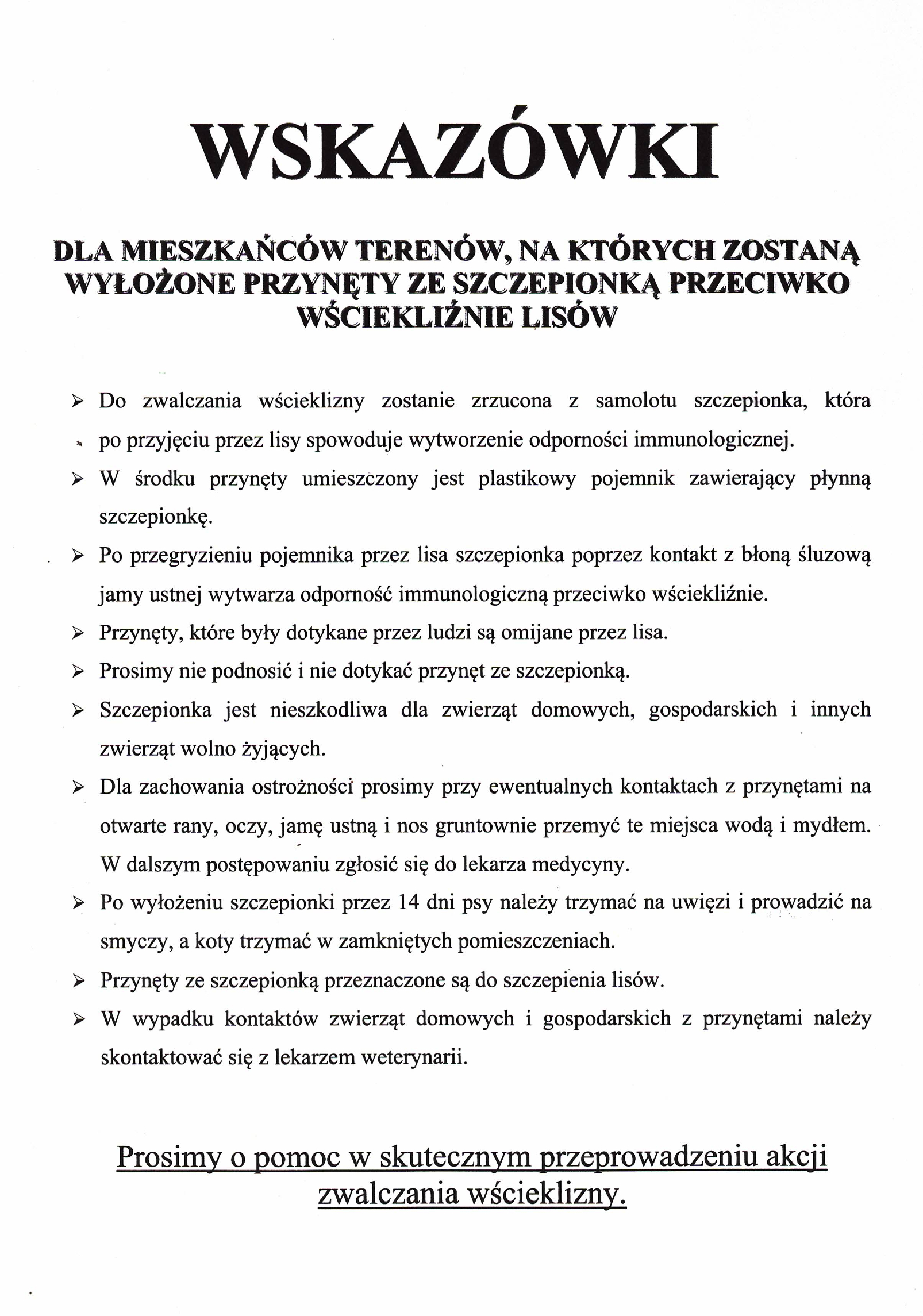 Informacja dla mieszkańców terenów, na których zostaną wyłożone przynęty ze szczepionką przeciwko wściekliźnie lisów
