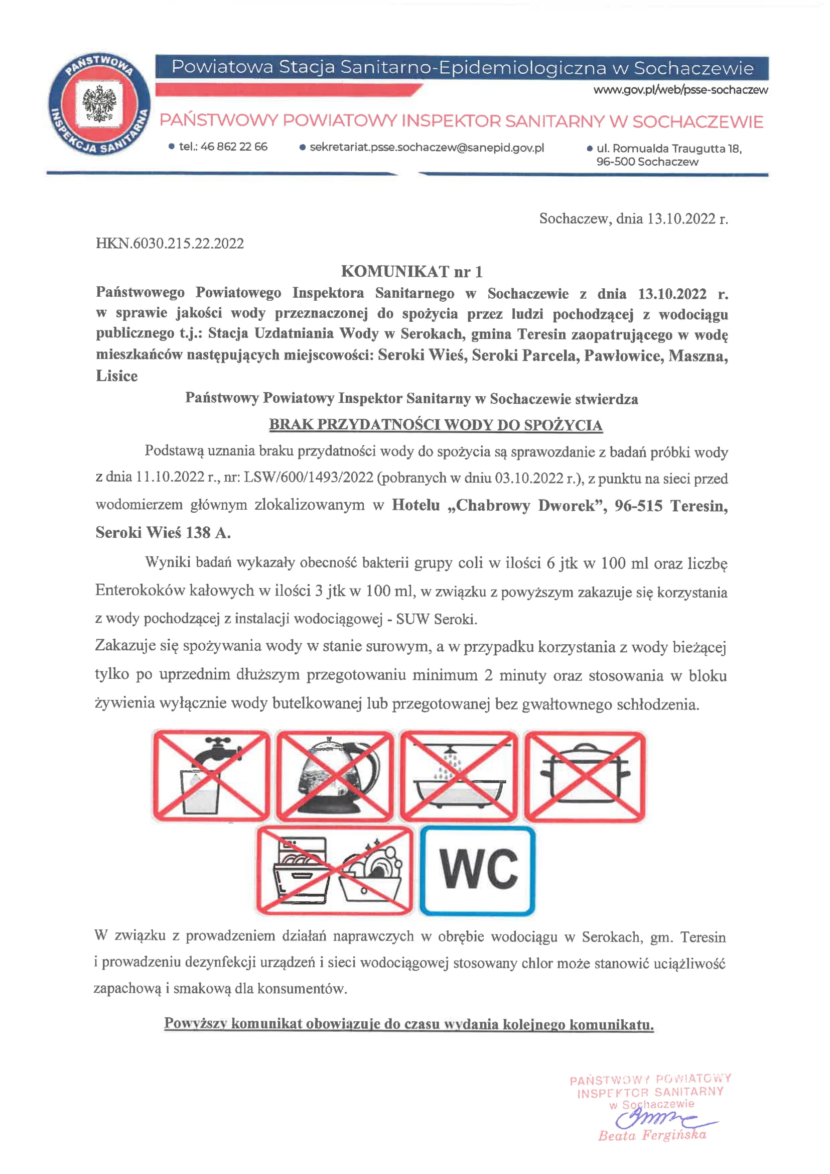 Komunikat nr 1 PPIS w Sochaczewie z dnia 13.10.2022 r. w sprawie braku przydatności wody do spożycia 13.10.2022 Zdjęcia (1) Pokaż zdjęcie 1 z galerii.