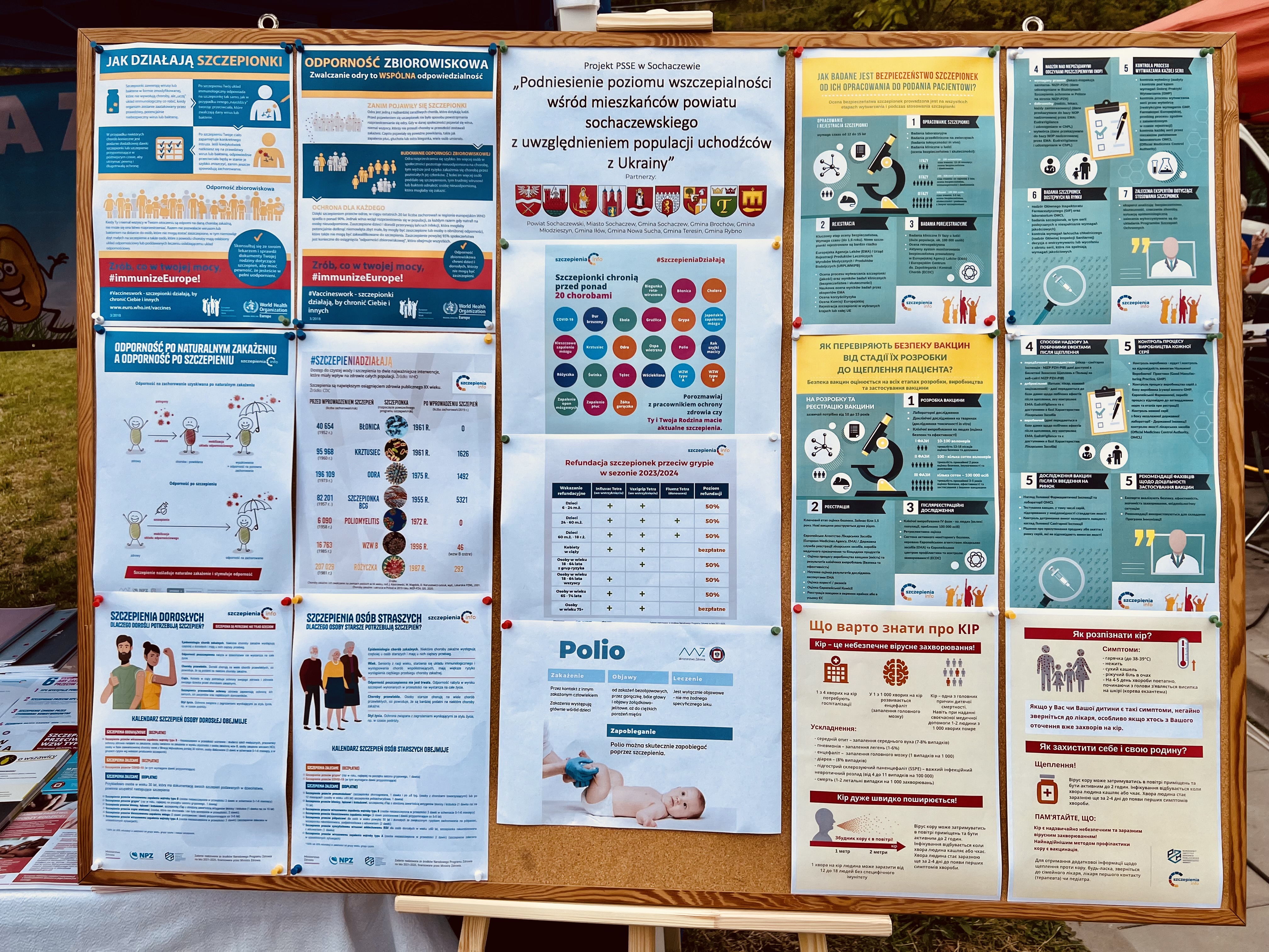 Na stoisku dystrybuowano materiały informacyjno-edukacyjne w językach polskim i ukraińskim. Przygotowano dwujęzyczną tablicę z informacjami m.in. na temat polio, salmonelli, WZW typu A, odry, krztuśca, pneumokoków, bezpieczeństwa szczepionek oraz czerpania informacji na temat szczepień ochronnych z rzetelnych źródeł. Ponadto promowano szczepienia obowiązkowe i zalecane, w tym szczepienia przeciwko grypie.
