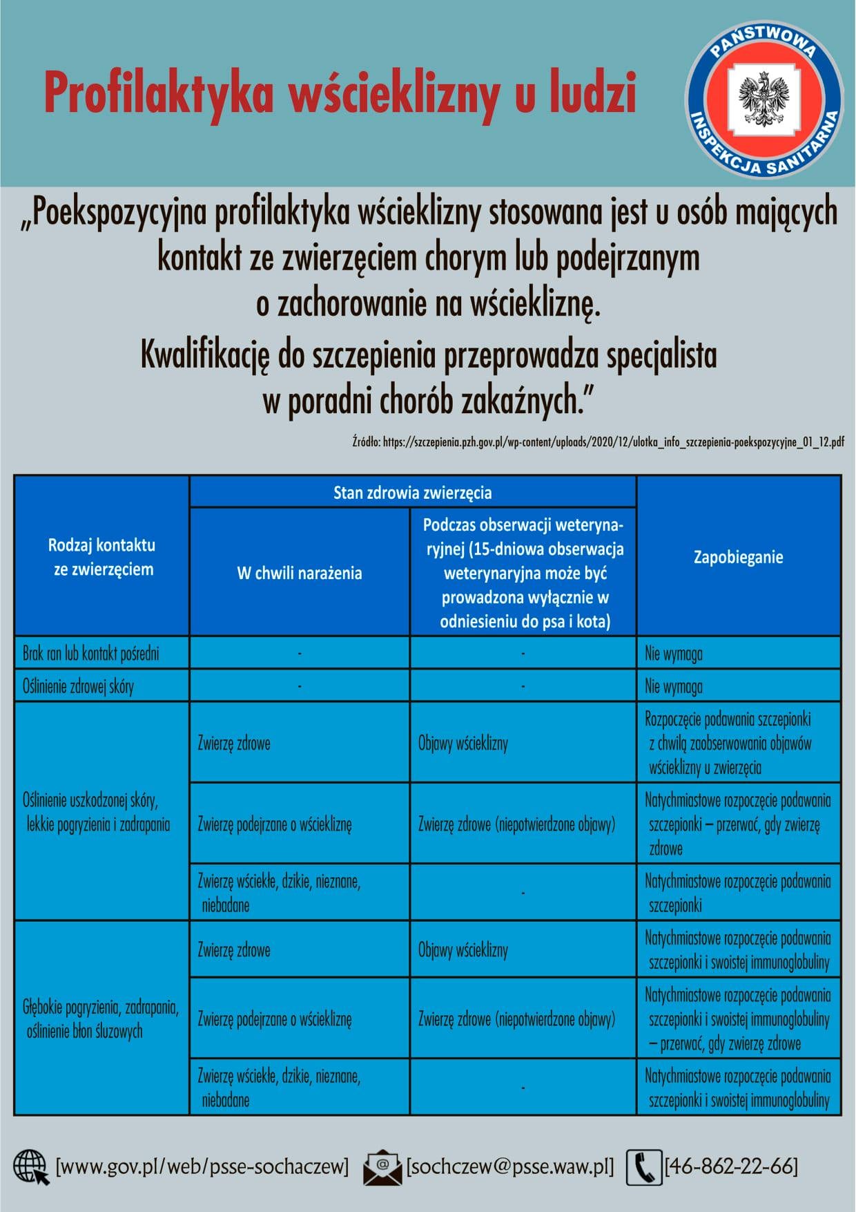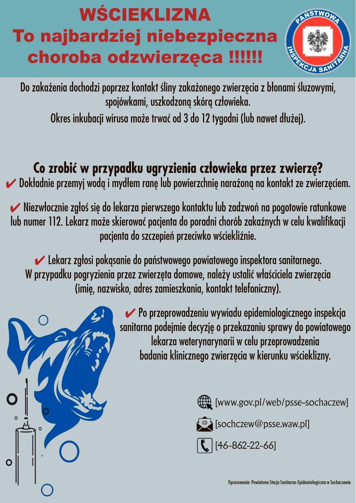 Państwowy Powiatowy Inspektor Sanitarny w Sochaczewie informuje, że w związku z wystąpieniem przypadków wścieklizny w powiecie gostynińskim, w dniu 15 kwietnia 2022 r., zostało opublikowane Rozporządzenie Wojewody Mazowieckiego, poz. 4604, zgodnie z którym cały obszar powiatu sochaczewskiego został włączony do obszaru zagrożonego wścieklizną. W trosce o zdrowie i życie mieszkańców powiatu przygotowano ulotkę edukacyjną.