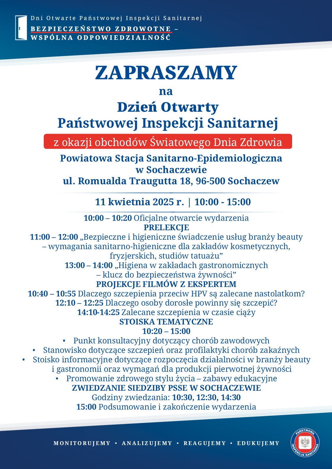 Serdecznie zapraszamy do udziału. To doskonała okazja, by zdobyć cenną wiedzę, porozmawiać z ekspertami oraz lepiej zrozumieć jaką rolę w trosce o zdrowie publiczne pełni Inspekcja Sanitarna.