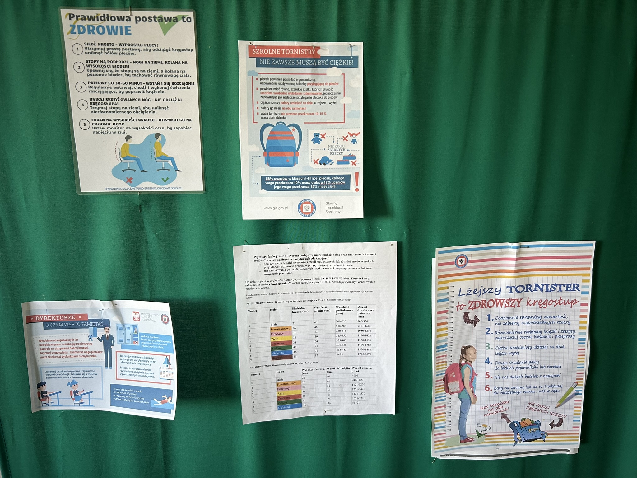 Dodatkowo zmierzono meble edukacyjne, które powinny być dostosowane do warunków antropometrycznych uczniów. W placówkach pozostawiono ulotki skierowane do uczniów, nauczycieli i rodziców dotyczące zalecanej wagi tornistra, zapewnienia miejsca na pozostawienie podręczników w szkole i dostosowania mebli edukacyjnych do warunków antropometrycznych uczniów.