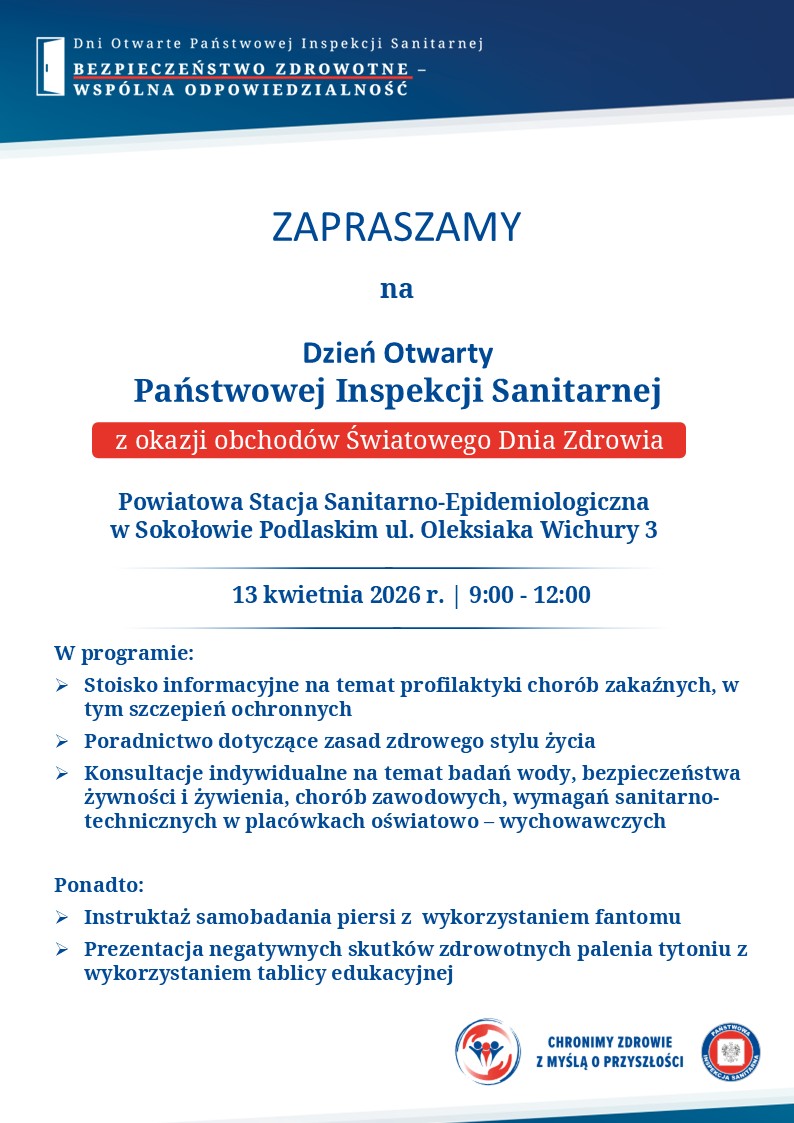 Zapraszamy na Dzień Otwarty Państwowej Inspekcji Sanitarnej z okazji obchodów Światowego Dnia Zdrowia, który odbędzie się w Powiatowej Stacji Sanitarno-Epidemiologicznej w Sokołowie Podlaskim przy ul. Oleksiaka wichury 3 dnia 13 kwietnia 2026 r. w godzinach 9:00 - 12:00.