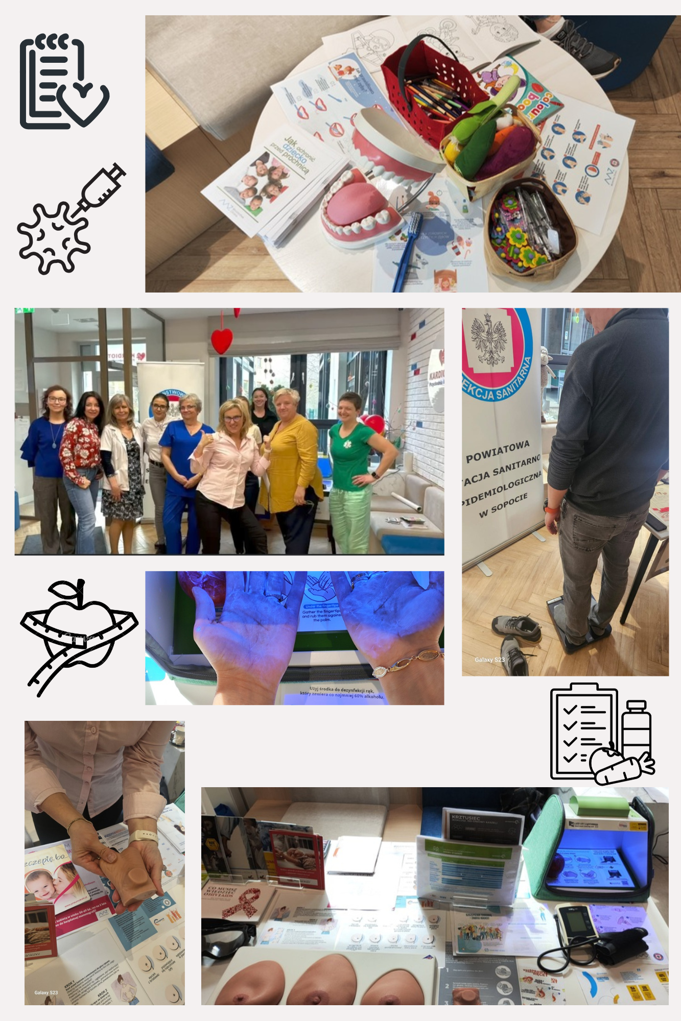 Dla dzieci prowadzono naukę higieny jamy ustnej na modelu szczęki oraz prawidłowej higieny rąk przy użyciu lampy UV.